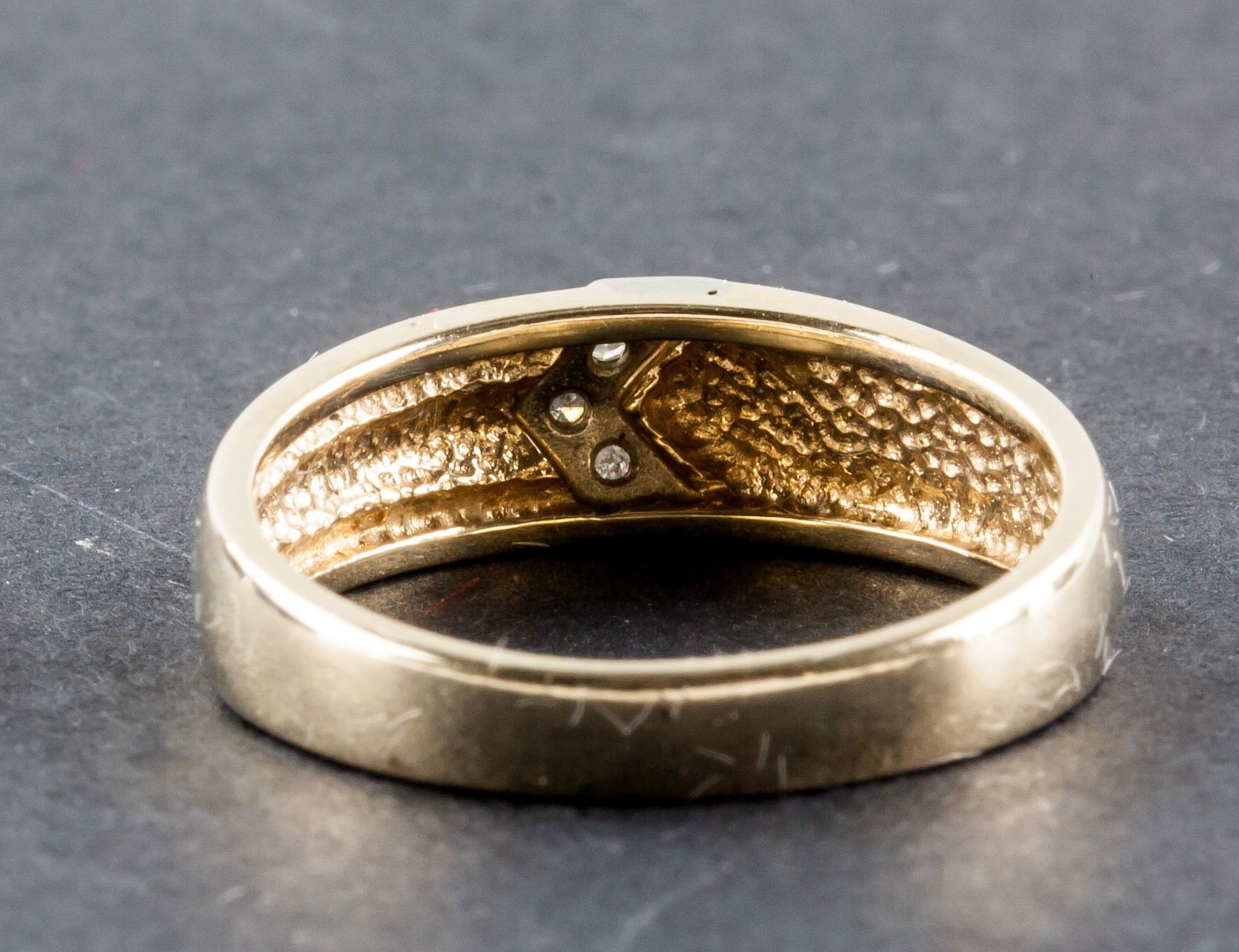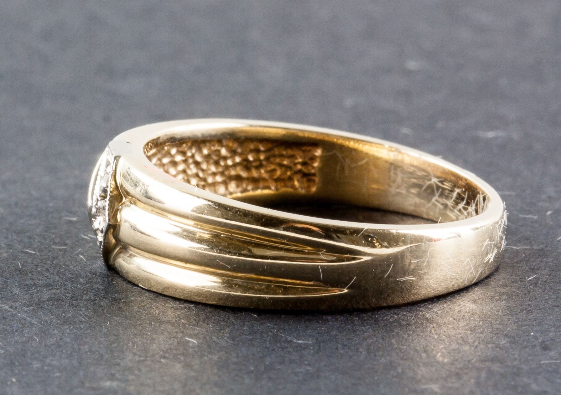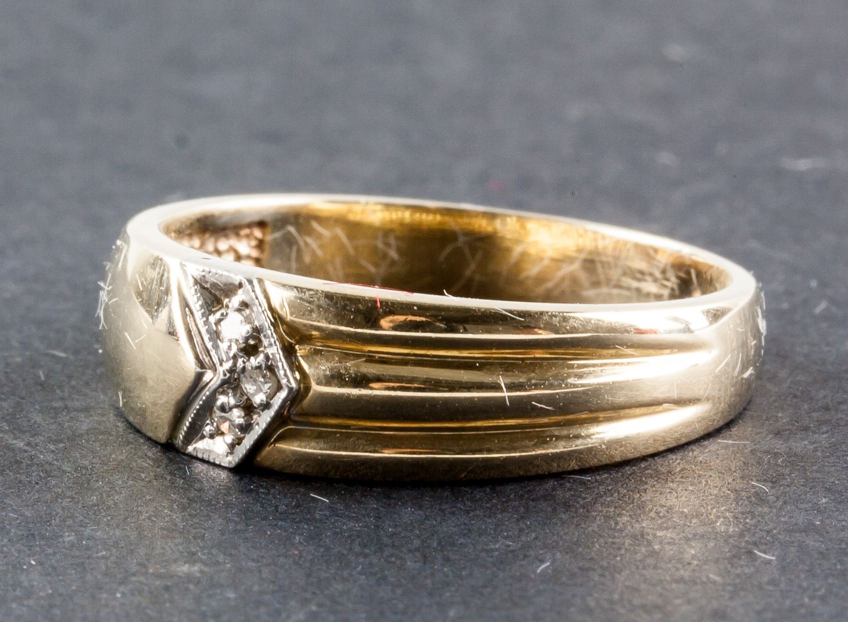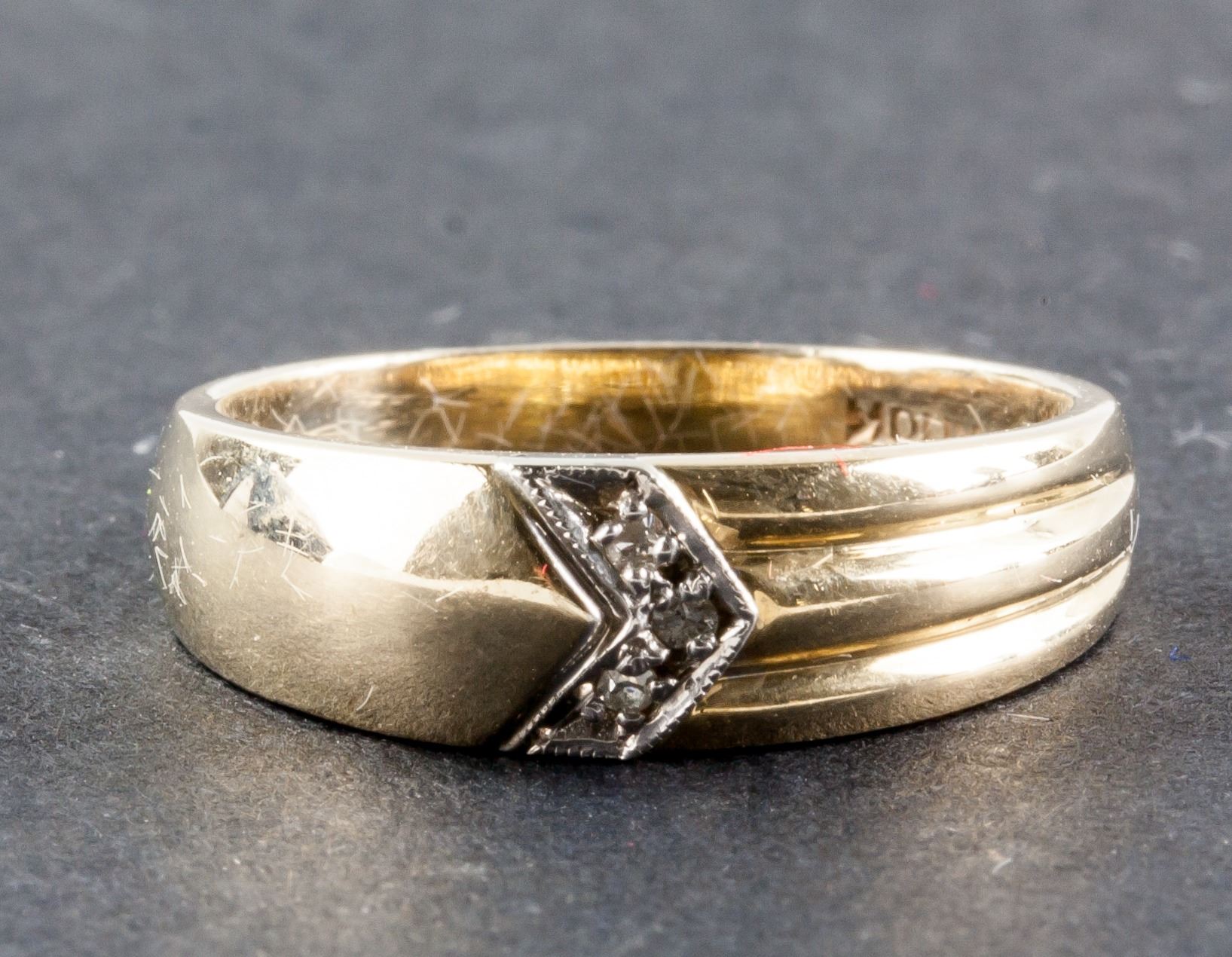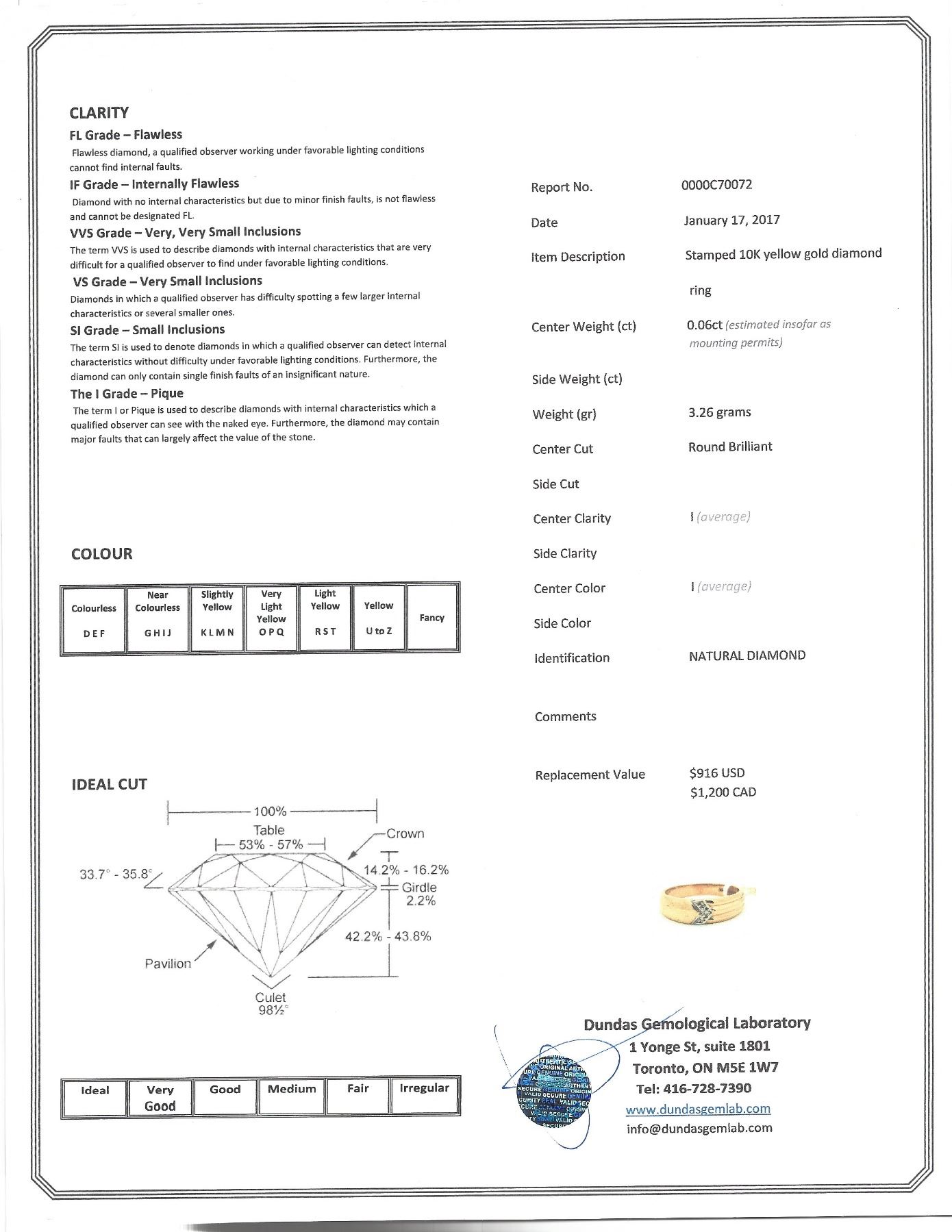 Stamped 10k yellow gold ring, set with 0.06ct round brilliant cut I clarity and color diamond. Certified replacement value $1200. 3.26 grams.