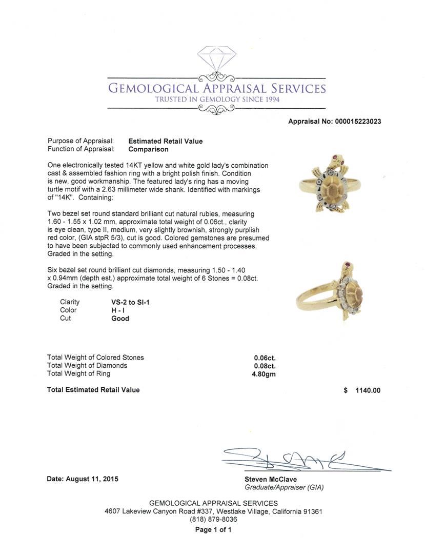 One electronically tested 14KT yellow and white gold lady's combination cast & assembled fashion ring with a bright polish finish. The featured lady's ring has a moving turtle motif with a 2.63 millimeter wide shank. Identified with markings of "14K". Condition is new, good workmanship. Containing: Two bezel set round standard brilliant cut natural rubies, measuring 1.60 - 1.55 x 1.02 mm, approximate. Total Weight of 0.06ct., clarity is eye clean, type II, medium, very slightly brownish, strongly purplish red color, (GIA stpR 5/3), cut is good. Colored gemstones are presumed to have been subjected to commonly used enhancement processes. Graded in the setting. Six bezel set round brilliant cut diamonds, measuring 1.50 - 1.40 x 0.94mm (depth est.) approximate. Total Weight of 6 Stones = 0.08ct. Graded in the setting. Clarity: VS-2 to SI-1. Color: H - I. Cut Good. Total Weight of Colored Stones 0.06ct. Total Weight of Diamonds 0.08ct. Total Weight of Ring 4.80gm. GAS Appraised at $1,140.00.
