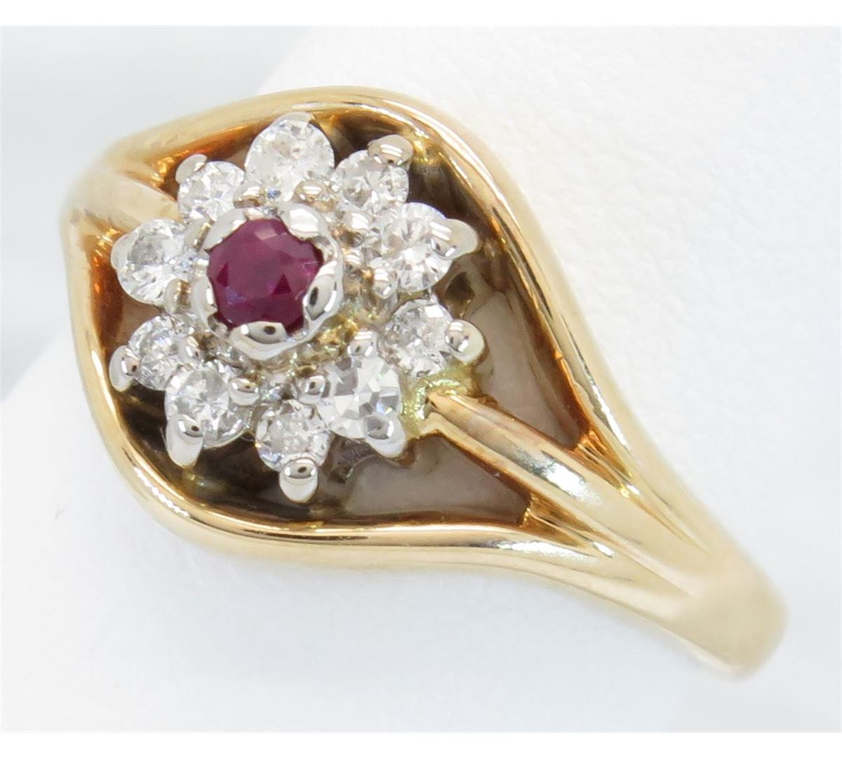 One tested 14K yellow gold diamond and ruby ring. Containing: One 2.5MM .07CT Ruby. Ten Round Brilliant Cut Diamonds. Approximate total diamond weight: .20CTW. Diamonds are graded in the mounting, unless otherwise stated. Weight: 4.4 grams, Size: 4.75.