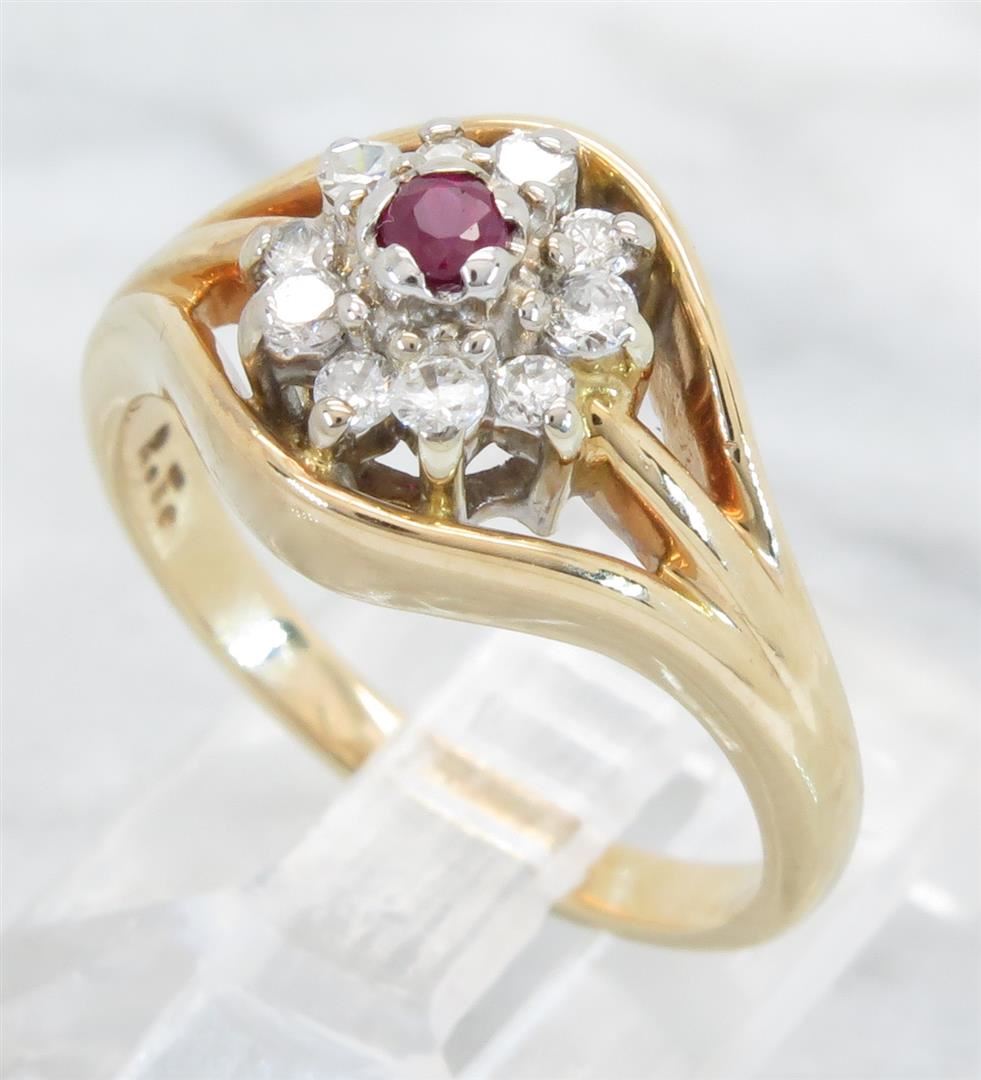 One tested 14K yellow gold diamond and ruby ring. Containing: One 2.5MM .07CT Ruby. Ten Round Brilliant Cut Diamonds. Approximate total diamond weight: .20CTW. Diamonds are graded in the mounting, unless otherwise stated. Weight: 4.4 grams, Size: 4.75.