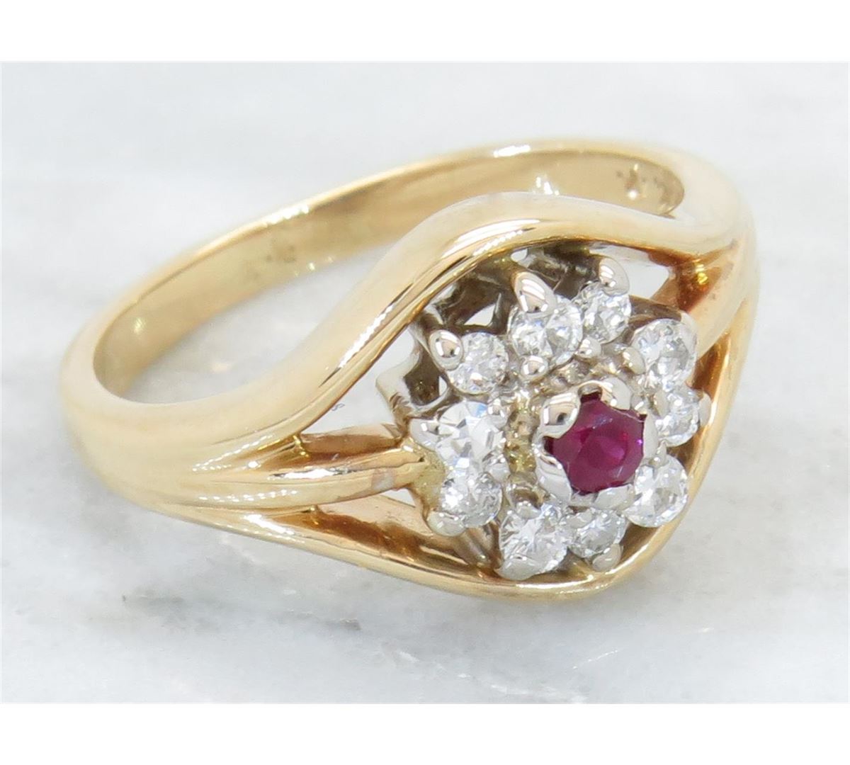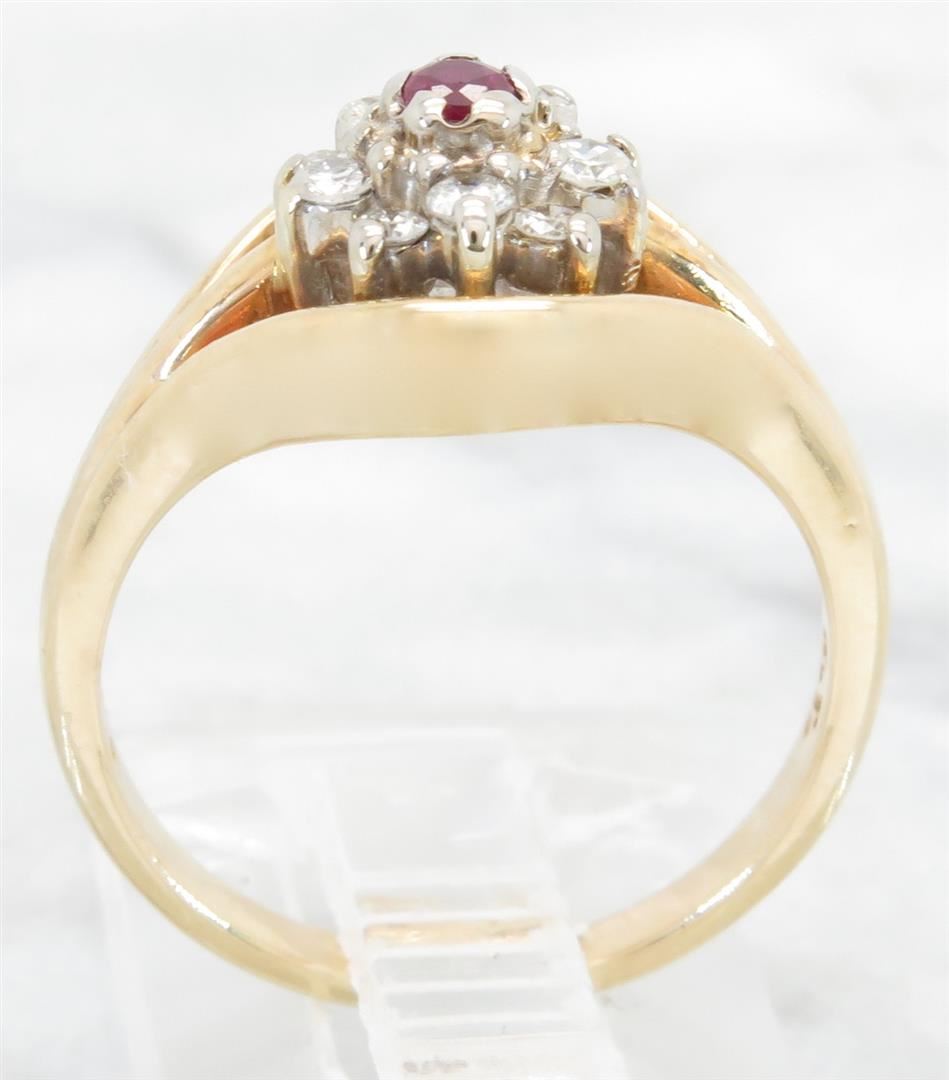 One tested 14K yellow gold diamond and ruby ring. Containing: One 2.5MM .07CT Ruby. Ten Round Brilliant Cut Diamonds. Approximate total diamond weight: .20CTW. Diamonds are graded in the mounting, unless otherwise stated. Weight: 4.4 grams, Size: 4.75.