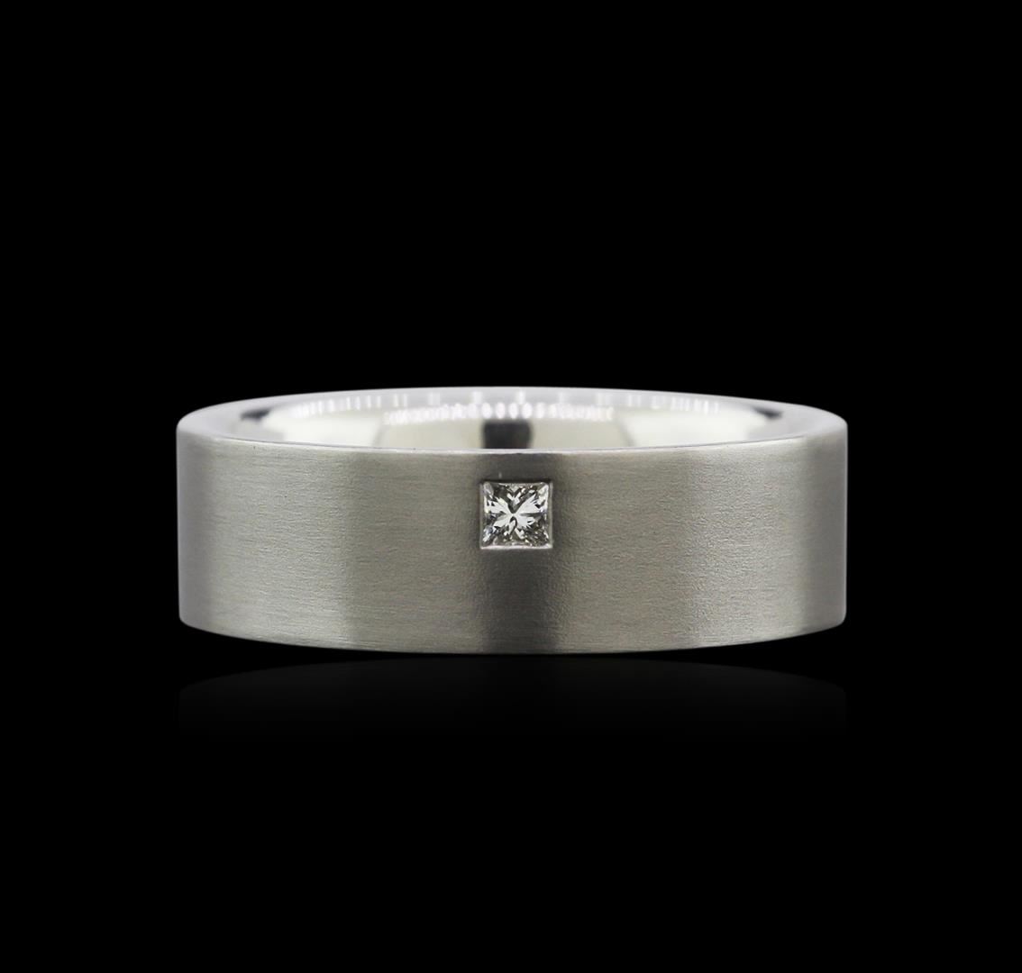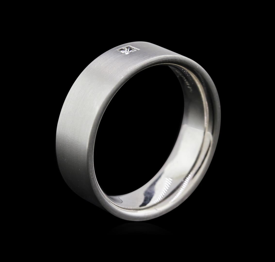 One electronically tested platinum mens cast diamond wedding band with a brushed finish. Identified with markings of "950". Condition is very good. Containing: One bezel set princess cut diamond, measuring 2.00 x 2.00 x 1.50mm (depth est.) approximate wei GGL Appraised at $1,790.00.