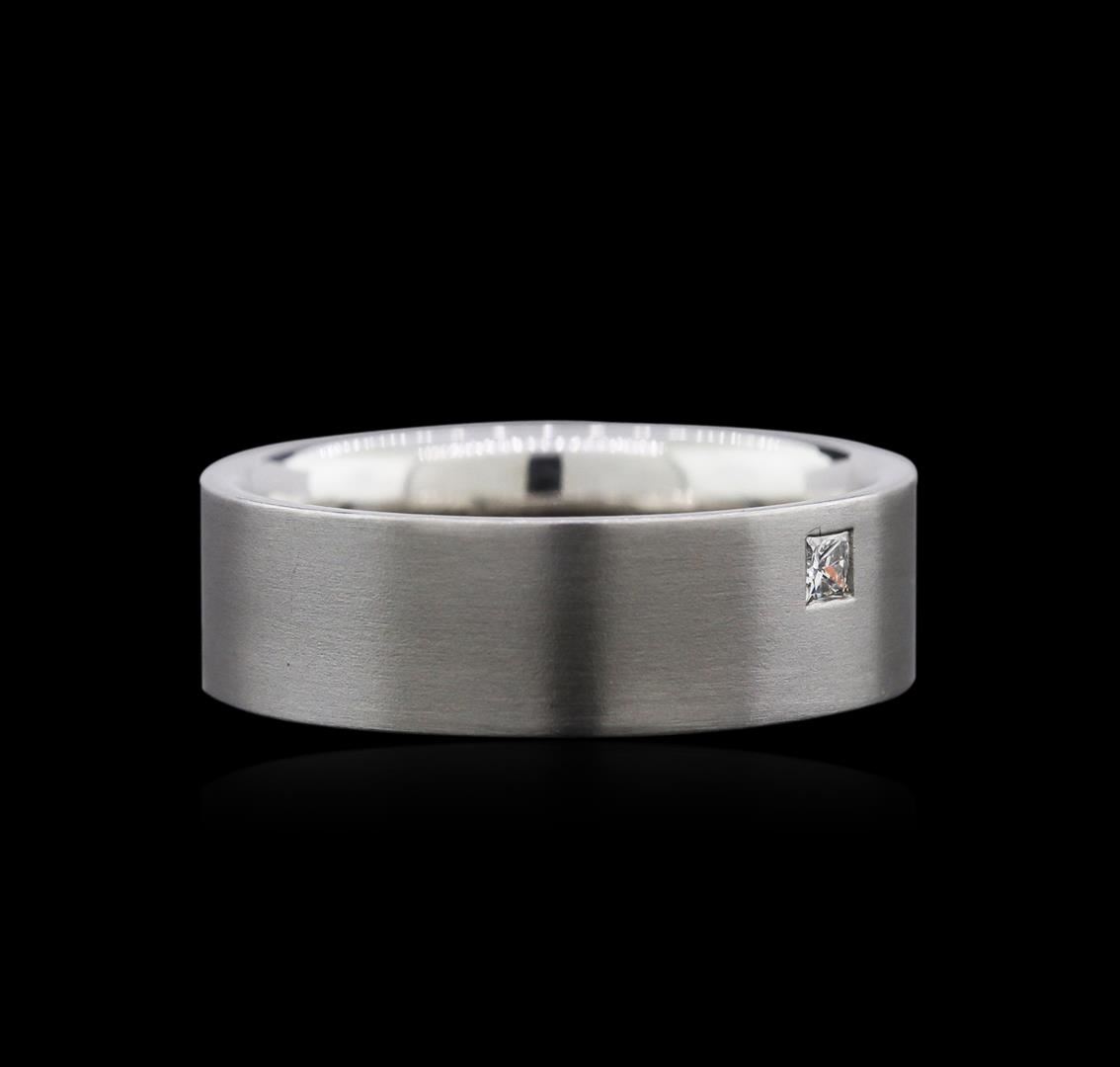 One electronically tested platinum mens cast diamond wedding band with a brushed finish. Identified with markings of "950". Condition is very good. Containing: One bezel set princess cut diamond, measuring 2.00 x 2.00 x 1.50mm (depth est.) approximate weight of 0.07ct. Clarity: VS-1. Color: G, Cut is Good. Diamonds are graded in the mounting, unless otherwise stated. Total Weight of Diamonds 0.07ct. Total Weight of Wedding Band 18.20 grams. GGL Appraised at $1,790.00.