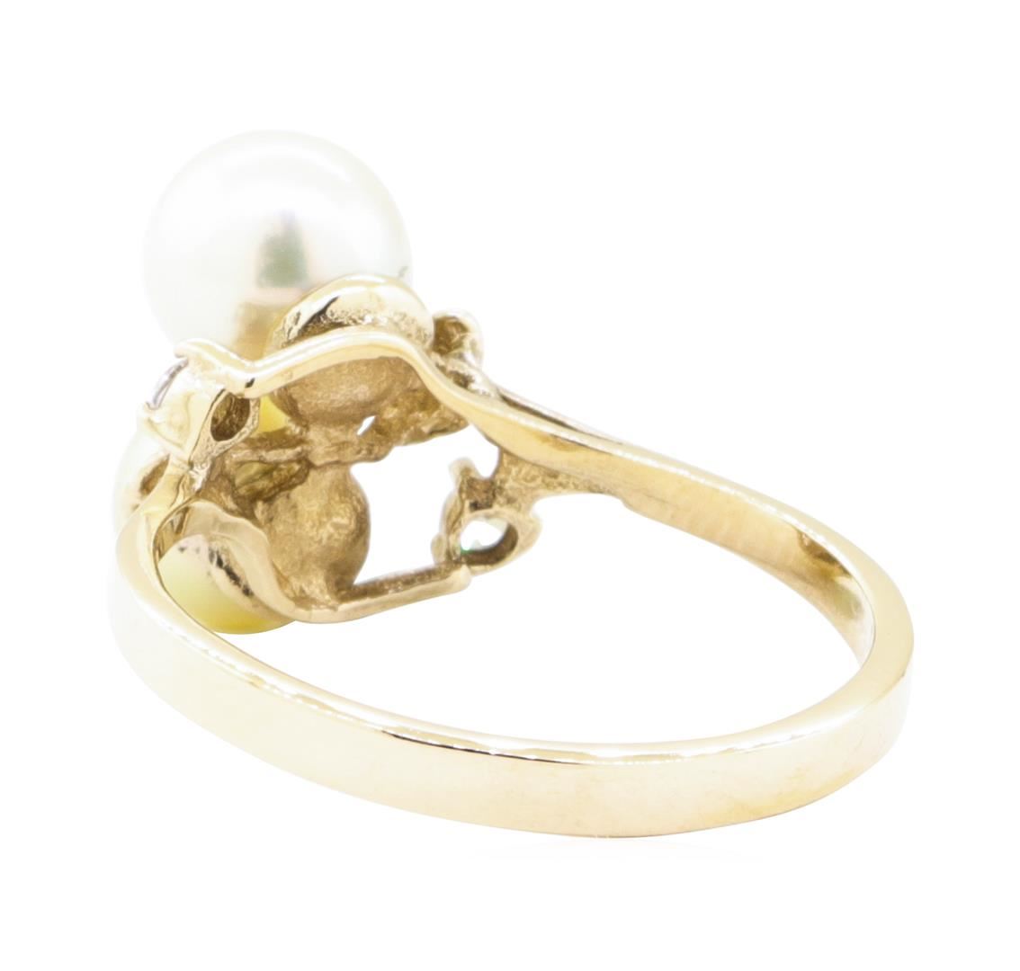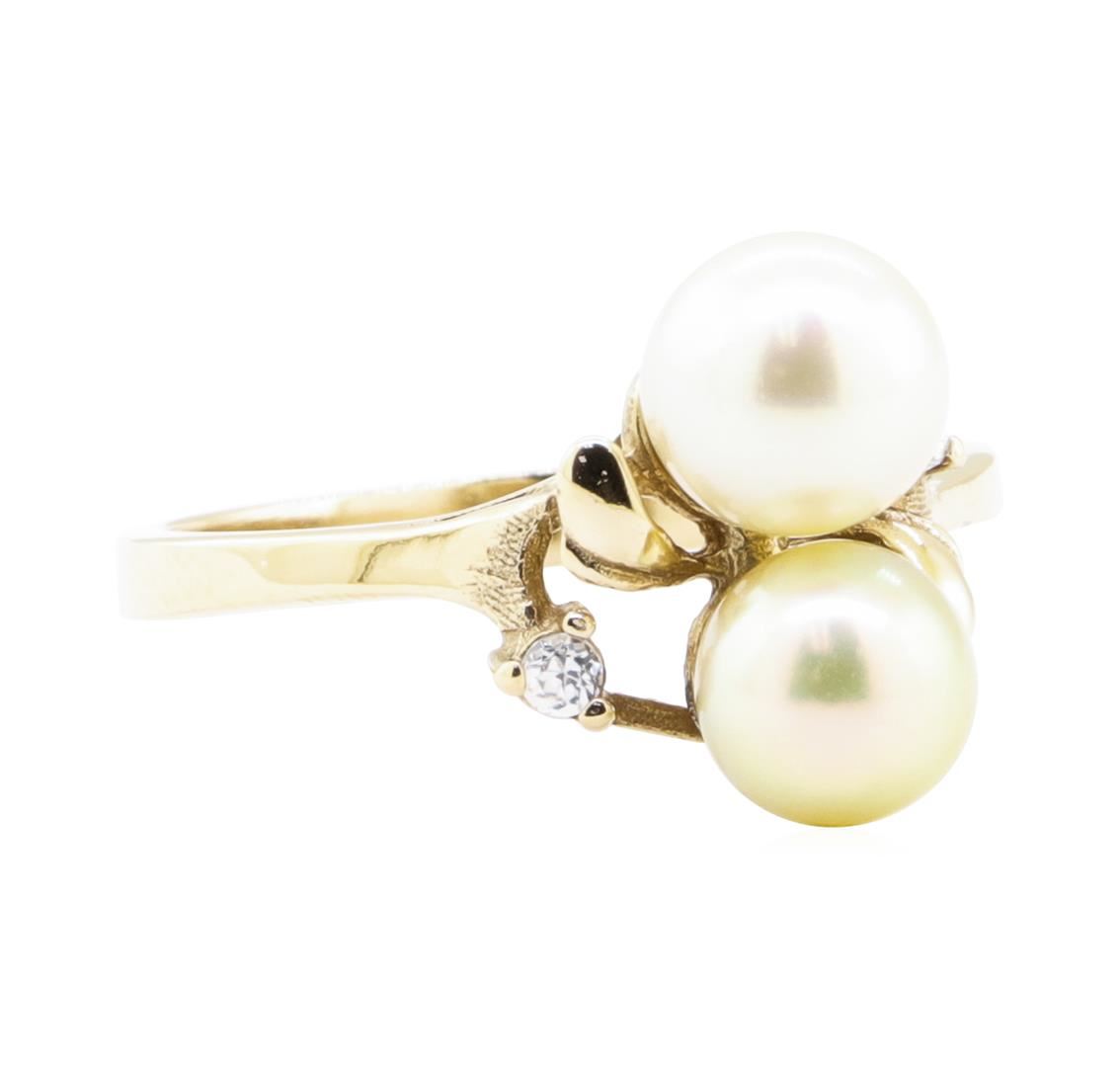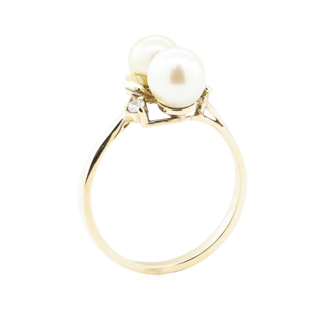 One ring featuring: 14KT yellow gold weighing 4.1 grams containing diamonds weighing 0.08ctw and two 7mm white round cultured pearls.