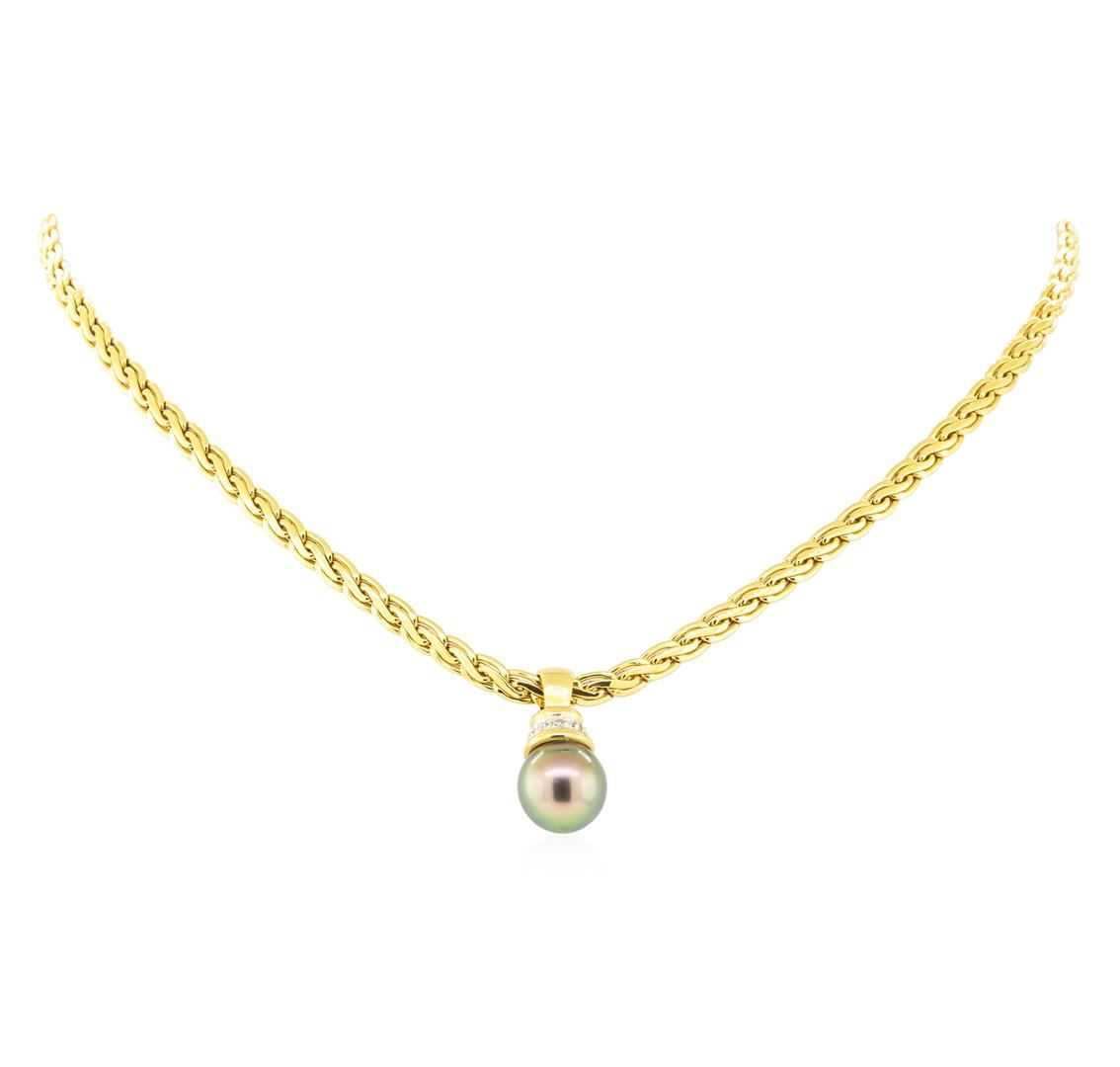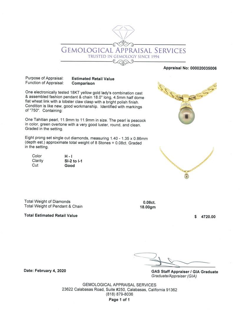 One electronically tested 18KT yellow gold lady's combination cast & assembled fashion pendant & chain 18.0' long, 4.5mm half dome flat wheat link with a lobster claw clasp with a bright polish finish. Identified with markings of '750'. Condition is like new, good workmanship. Containing: One Tahitian pearl, 11.9mm to 11.9mm in size. The pearl is peacock in color, green overtone with a very good luster, round, and clean. Graded in the setting. Eight prong set single cut diamonds, measuring 1.40 - 1.35 x 0.86mm (depth est.) approximate total weight of 8 Stones = 0.08ct. Graded in the setting. Color H - I Clarity SI-2 to I-1 Cut Good. Total Weight of Diamonds 0.08ct.. Total Weight of Pendant & Chain 18.00gm GAS Appraised at $4720.00. GAS Appraised.