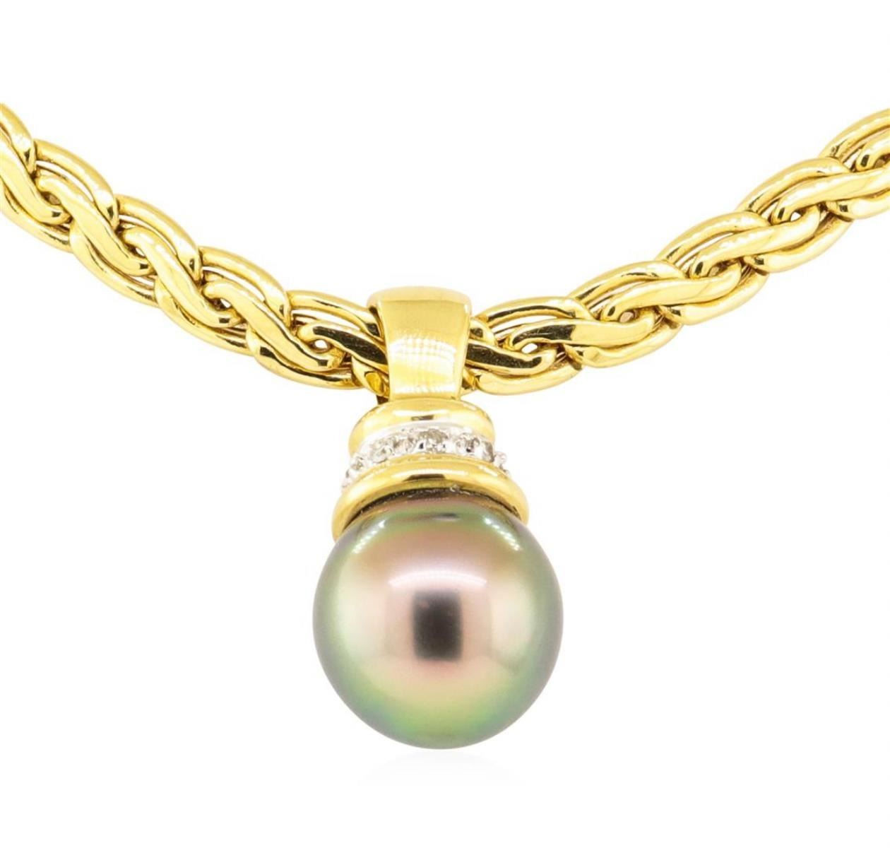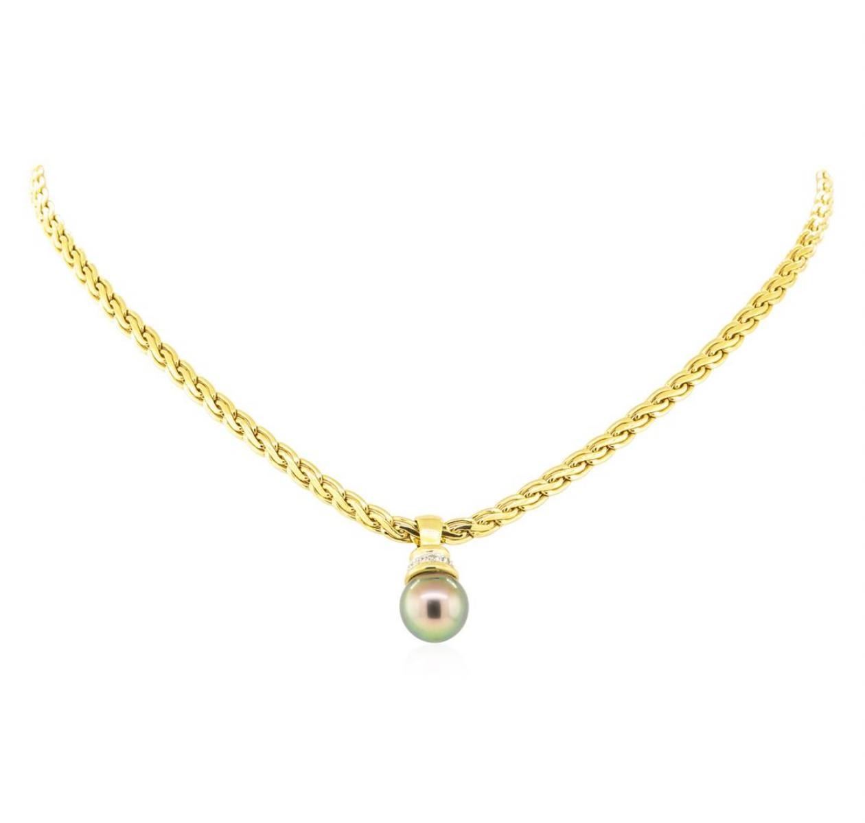 One electronically tested 18KT yellow gold lady's combination cast & assembled fashion pendant & chain 18.0' long, 4.5mm half dome flat wheat link with a lobster claw clasp with a bright polish finish. Identified with markings of '750'. Condition is like new, good workmanship. Containing: One Tahitian pearl, 11.9mm to 11.9mm in size. The pearl is peacock in color, green overtone with a very good luster, round, and clean. Graded in the setting. Eight prong set single cut diamonds, measuring 1.40 - 1.35 x 0.86mm (depth est.) approximate total weight of 8 Stones = 0.08ct. Graded in the setting. Color H - I Clarity SI-2 to I-1 Cut Good. Total Weight of Diamonds 0.08ct.. Total Weight of Pendant & Chain 18.00gm GAS Appraised at $4720.00. GAS Appraised.