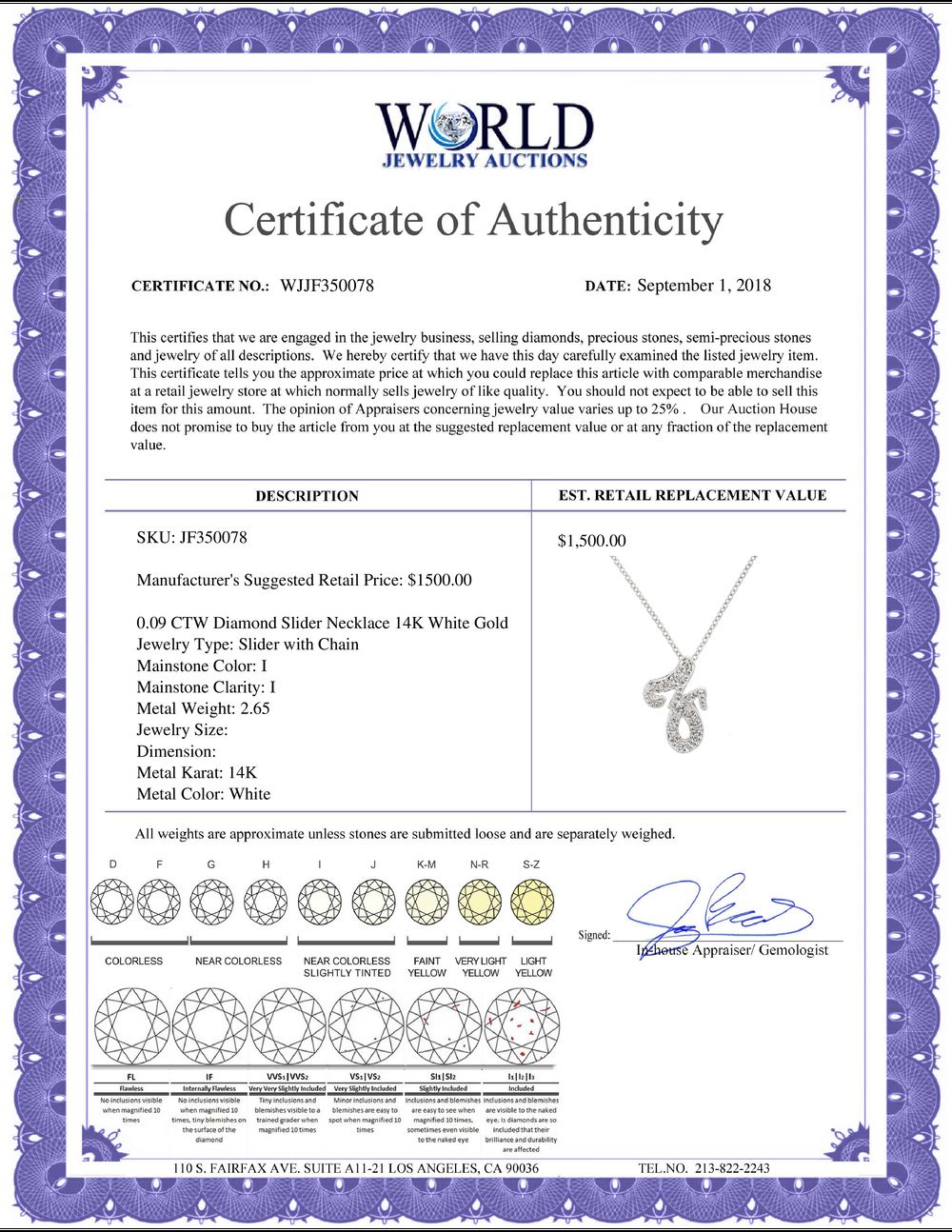 WORLD JEWELRY AUCTION believes to the best of its knowledge that the information presented in any listing has come from reliable sources. Such information is presented solely for the convenience of the Purchaser. WJA makes no warranties of any kind related to the information presented in any listing. WJA further makes no warranties, either express or implied, relating to the value, marketability or condition of the lot described in any listing. Prospective bidders should investigate a lot thoroughly before bidding. By bidding the Bidder acknowledges that Bidder has investigated the lot to his or her satisfaction, or, that Bidder has chosen not to do so, and agrees to accept the lot being bid on with no objections after the sale closes. If you are uncertain please contact us with your questions prior to bidding. If you are still uncertain after we reply, please refrain from bidding. Photos other graphic material contained in any listing of generic or duplicate lots may be stock presentations and not necessarily of the specific lot.
