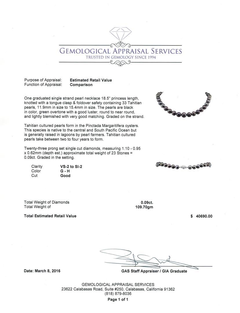 One graduated single strand pearl necklace 18.5" princess length, knotted with a tongue clasp & foldover safety containing 33 Tahitian pearls, 11.9mm in size to 15.4mm in size. The pearls are black in color, green overtone with a good luster, round to near round, and lightly blemished with very good matching. Graded on the strand. Tahitian cultured pearls form in the Pinctada Margaritifera oysters. This species is native to the central and South Pacific Ocean but is generally raised in lagoons by pearl farmers. Tahitian cultured pearls take between two to four years to form. Twenty-Three prong set single cut diamonds, measuring 1.10 - 0.95 x 0.62mm (depth est.) approximate total weight of 23 Stones = 0.09ct. Graded in the setting. Clarity: VS-2 to SI-2. Color: G - Good. Total Weight of Diamonds 0.09ct. Total Weight of 109.70gm. GAS Appraised at $40,690.00.