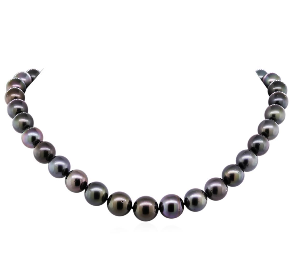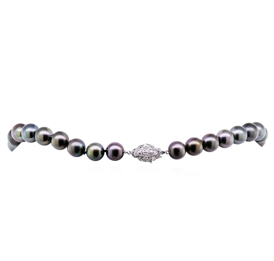One graduated single strand pearl necklace 18.0" princess length, knotted with a tongue clasp & foldover safety containing 35 Tahitian pearls, 11.0mm in size to 14.2mm in size. The pearls are black in color, green overtone with a very good luster, round to near round, and lightly blemished with very good matching. Graded on the strand. Tahitian cultured pearls form in the Pinctada Margaritifera oysters. This species is native to the central and South Pacific Ocean but is generally raised in lagoons by pearl farmers. Tahitian cultured pearls take between two to four years to form. Twenty-Three prong set single cut diamonds, measuring 1.10 - 0.95 x 0.64mm (depth est.) approximate total weight of 23 Stones = 0.09ct. Graded in the setting. Clarity: VS-2 to SI-1. Color: G - Good. Total Weight of Diamonds 0.09ct. Total Weight of 94.70gm. GAS Appraised at $25,585.00.
