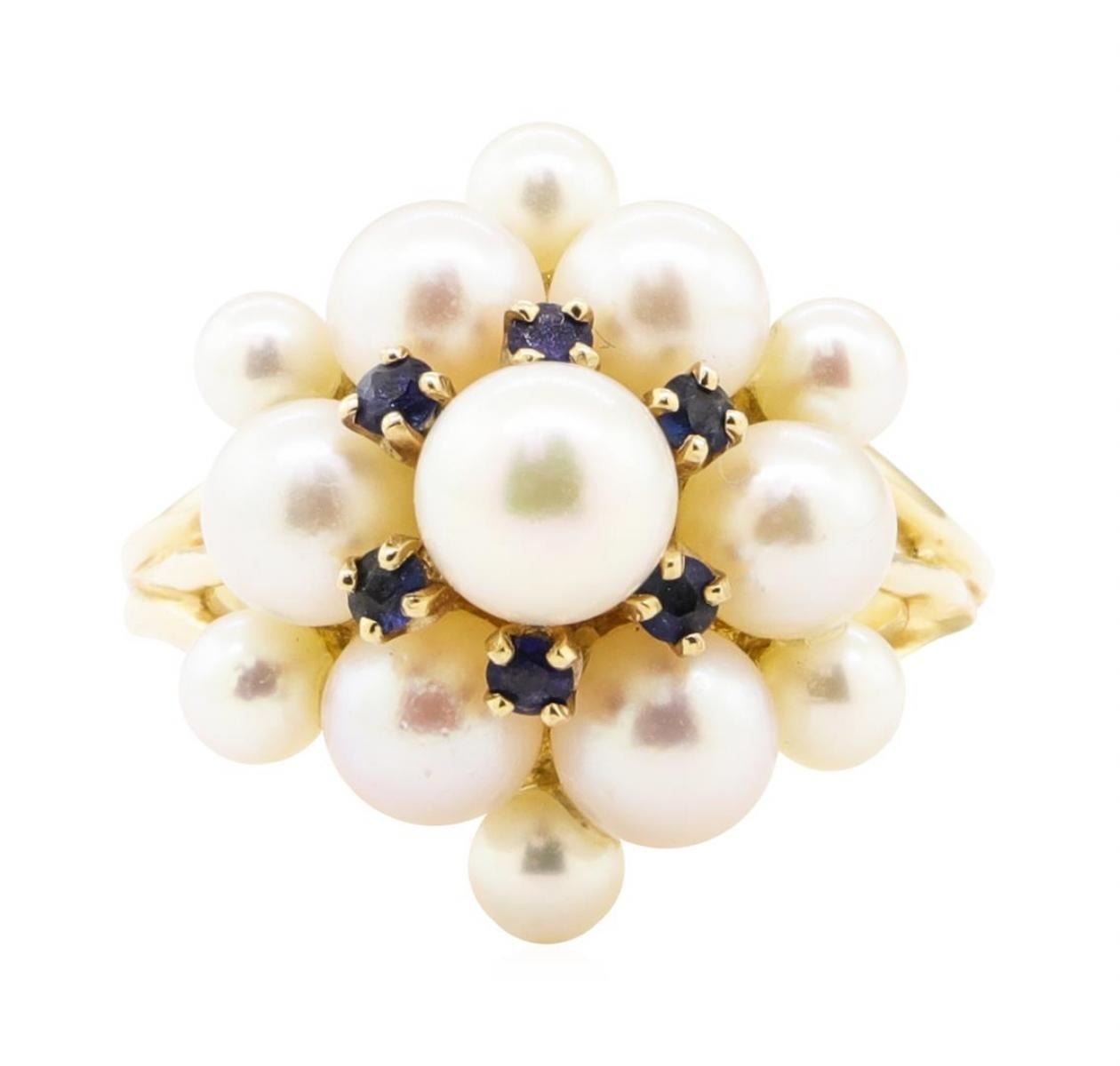 One cluster ring featuring: 14KT yellow gold weighing 8.0 grams containing blue sapphies weighing 0.10ctw and thirteen pearls measuring 6.4 to 3.8 millimeters in diameter.