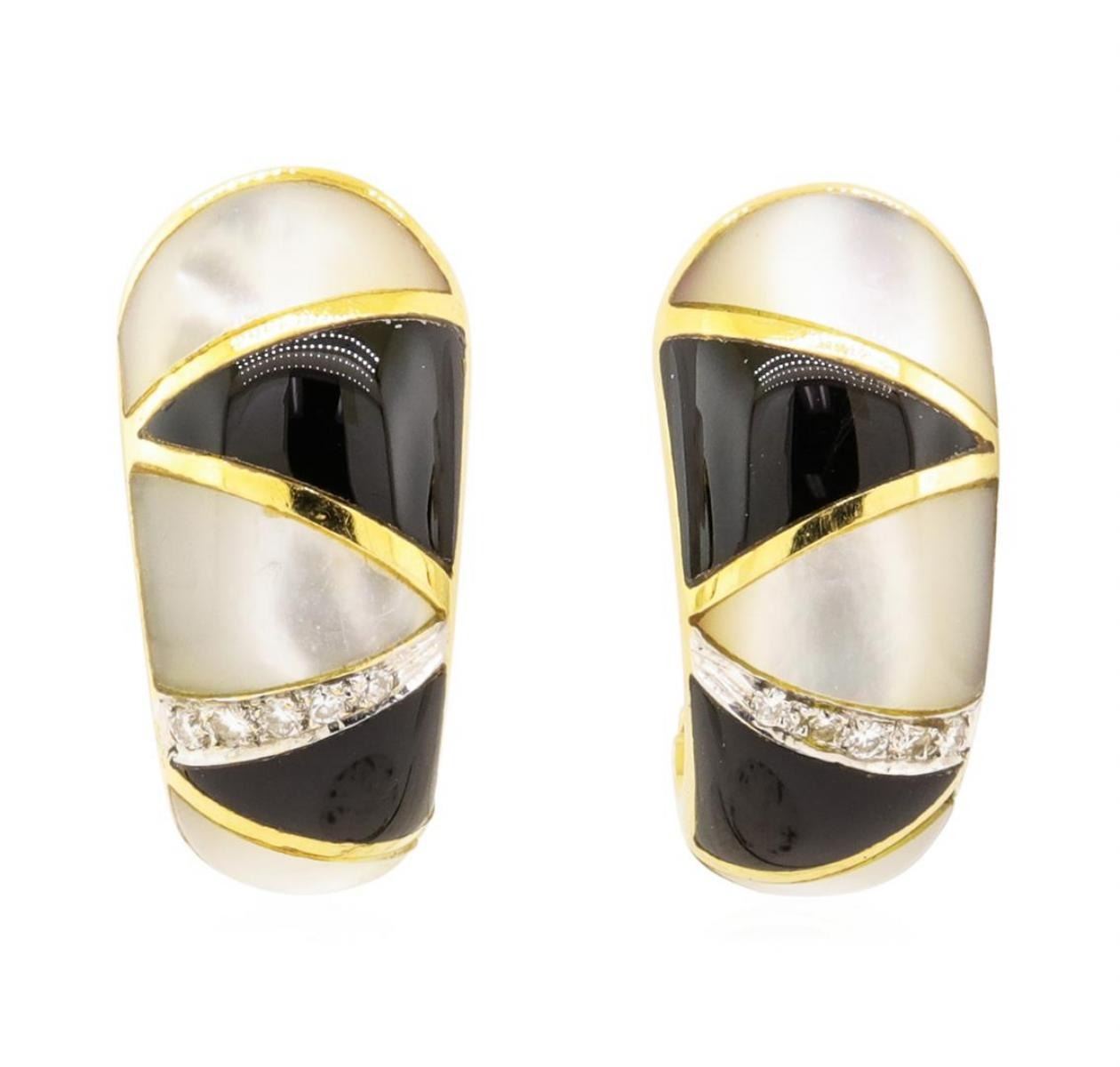 One pair electronically tested 18KT yellow gold lady's combination cast & assembled fashion earrings with Omega clip backs with posts with a bright polish finish. The featured earrings contain triangular inlaid pieces of mother of pearl and black onyx. Identified with markings of '18K 750'. Condition is like new, good workmanship. Containing: Ten bead set round brilliant cut diamonds, measuring 1.40 - 1.35 x 0.86mm (depth est.) approximate total weight of 10 Stones = 0.10ct. Graded in the setting. Color H - I Clarity VS-2 to SI-1 Cut Very Good. Total Weight of Diamonds 0.10ct.. Total Weight of Earrings 11.30gm GAS Appraised at $2875.00. GAS Appraised.