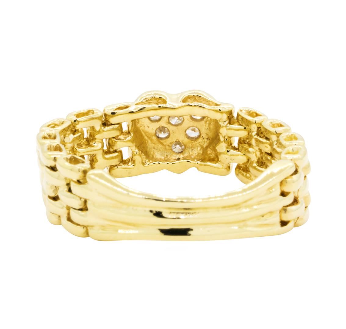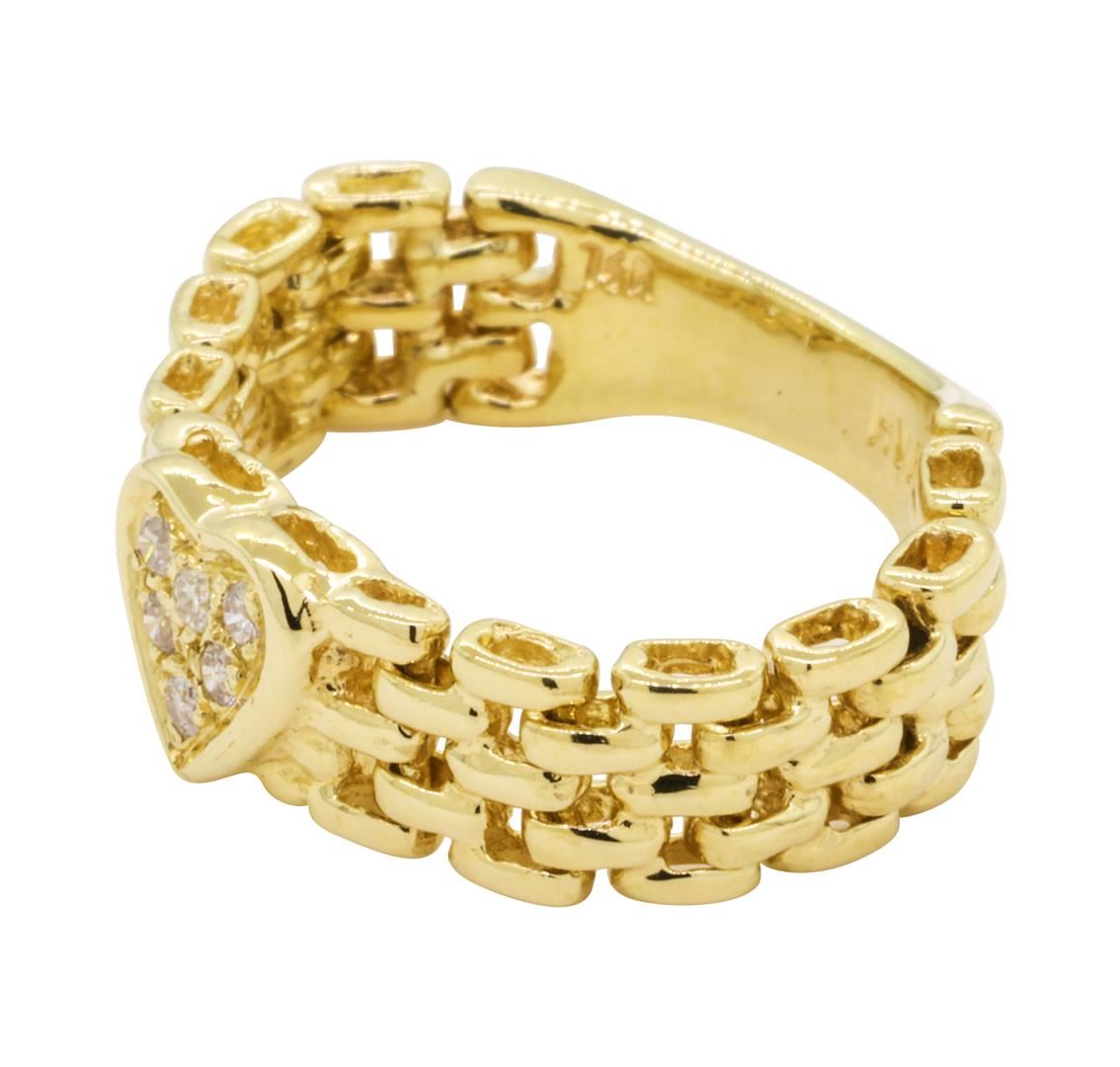 One lady's ring with a heart shaped motif featuring: 14KT yellow gold weighing 4.7 grams contaning diamonds weighing 0.10ctw.