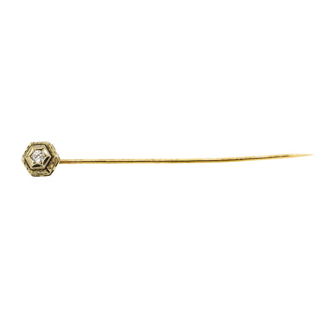 One stick pin featuring: 14KT yellow and white gold weighing 1.0 grams and one old mine diamond weighing 0.10ct.