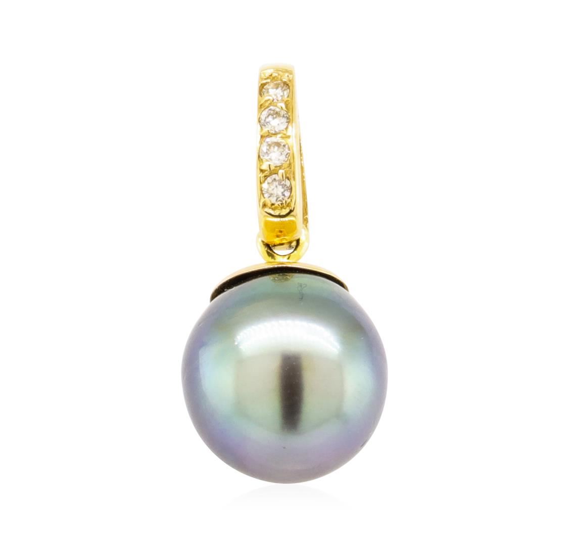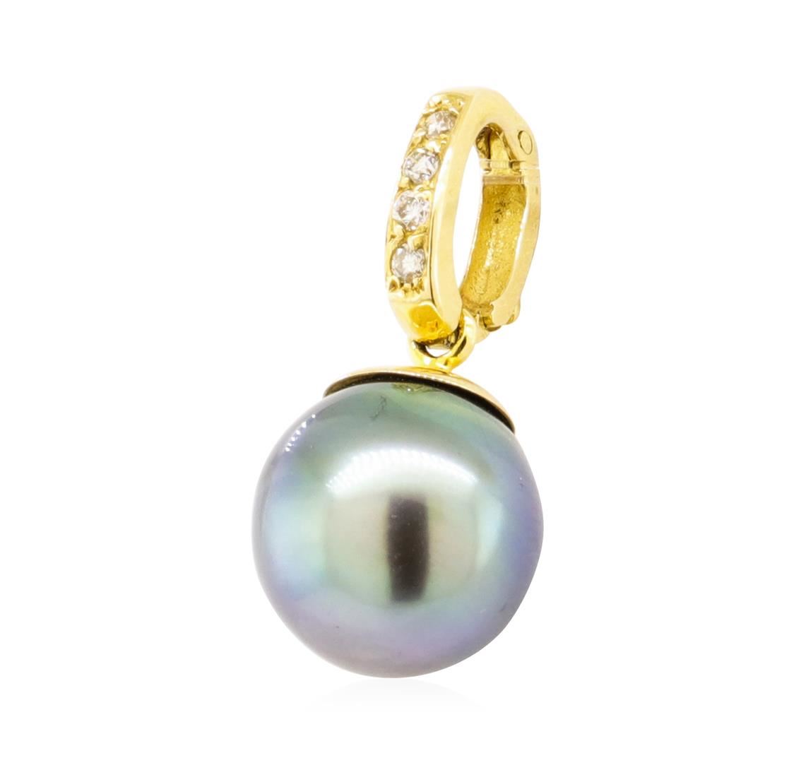 One pearl pendant enhancer featuring: 18KT yellow gold weighing 3.6 grams containing diamonds weighing 0.10ctw and a black Tahitian pearl measuring 11.80 millimeter in diameter.