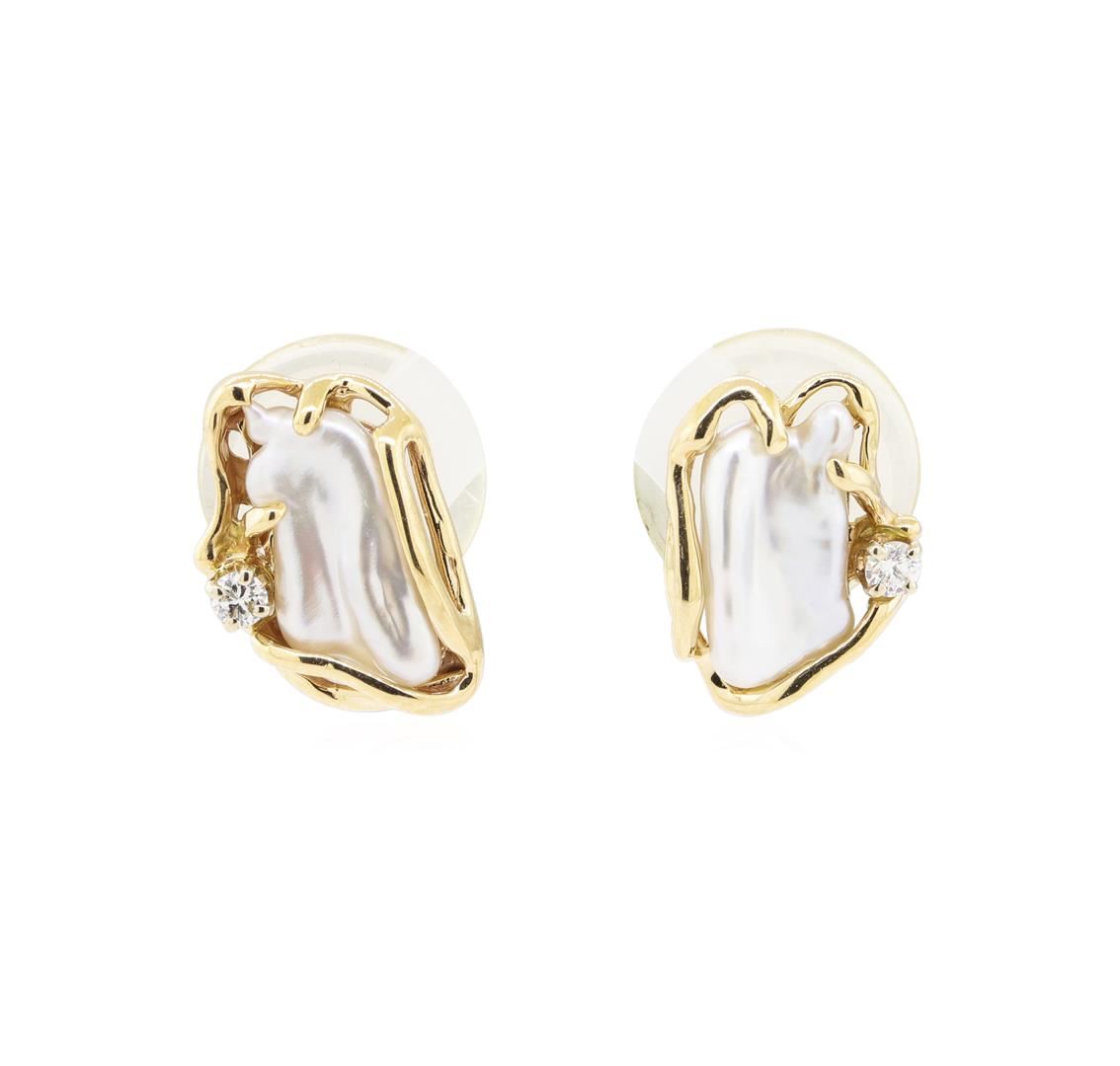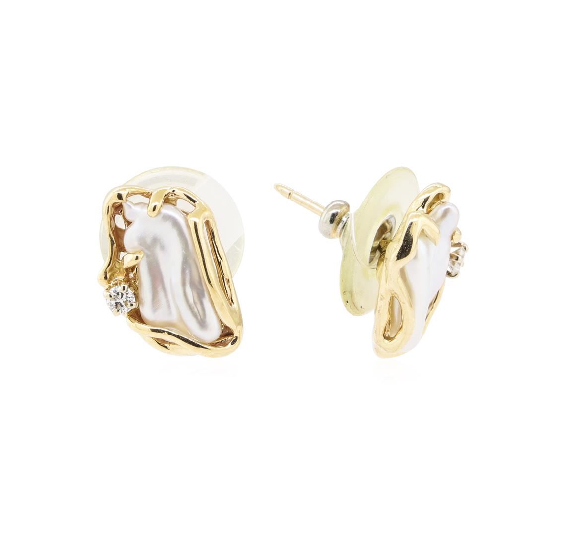 One pair of earrings with friction posts featuring: 14KT yellow gold weighing 5.0 grams containing two freshwater pearls and diamonds weighing 0.10ctw.