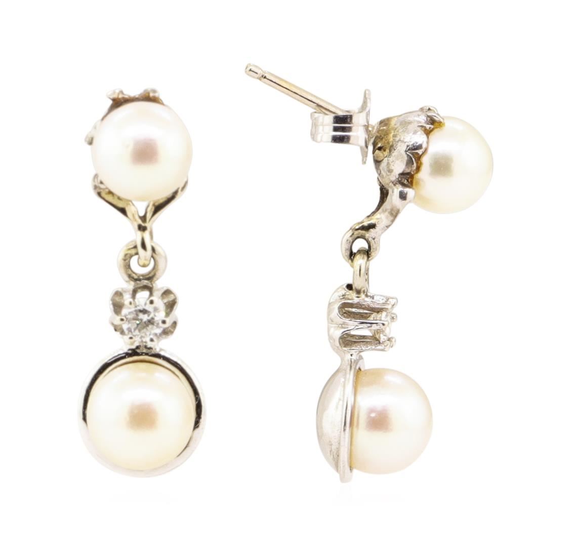 One pair of dangle earrings with a drop of 23 millimeters featuring: 14KT white gold weighing 3.9 grams containing diamonds weighing 0.10 ctw and four pearls.