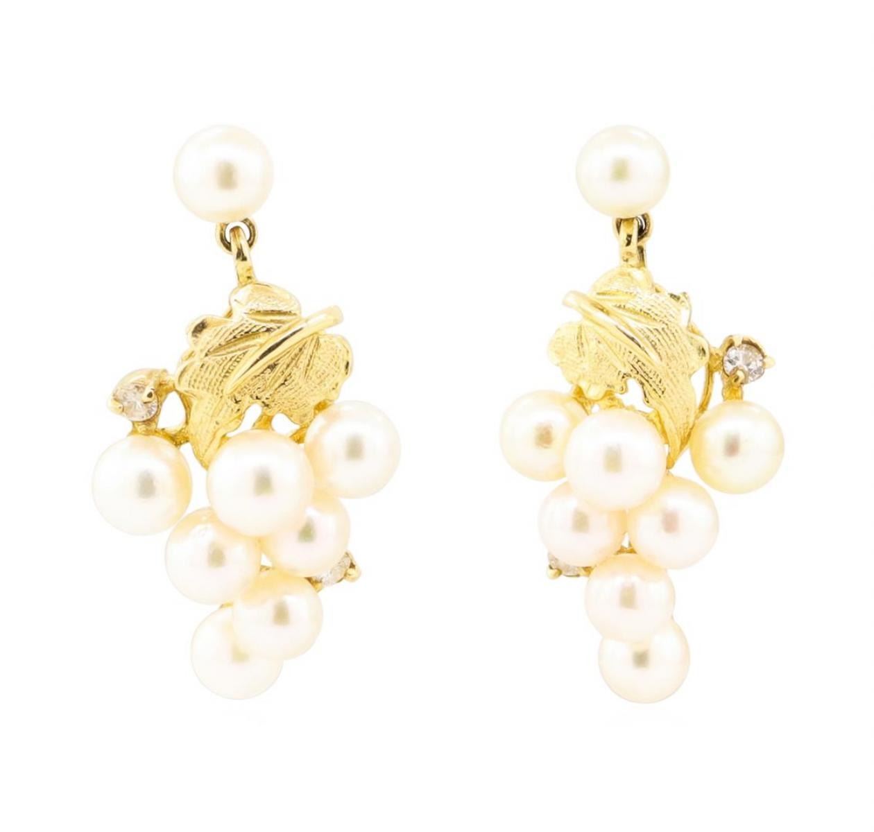 One pair of grape cluster earrings featuring: 14KT yellow gold weighing 4.7 grams containing diamonds weighing 0.10ctw and sixteen pearls measuring 5.0 millimeters in diameter/
