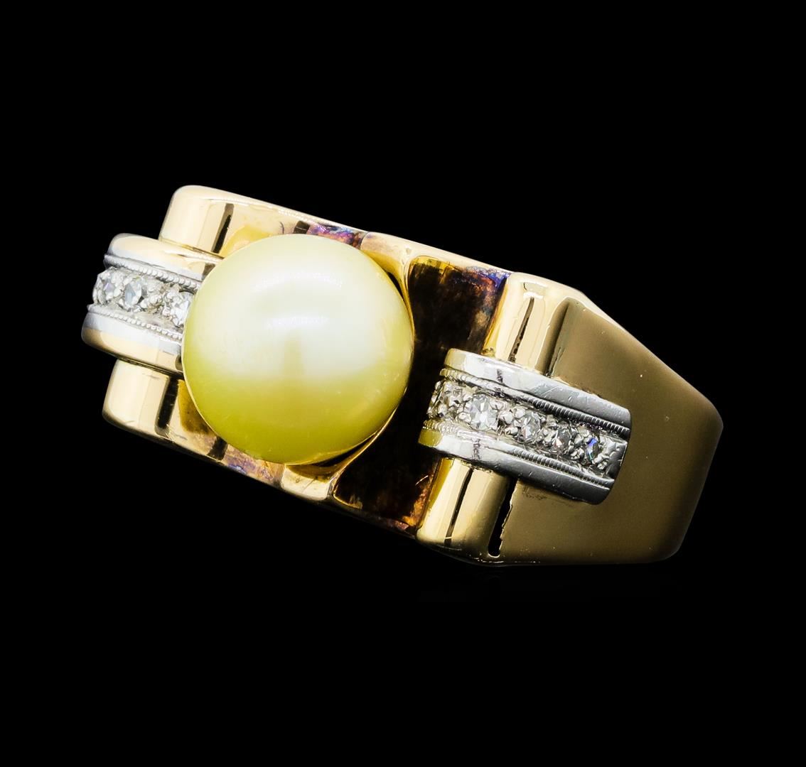 One lady's ring featuring: 14KT yellow and white weighing 9.9 grams containing one pearl measuring 8.8mm and single cut diamonds weighing 0.10ctw.