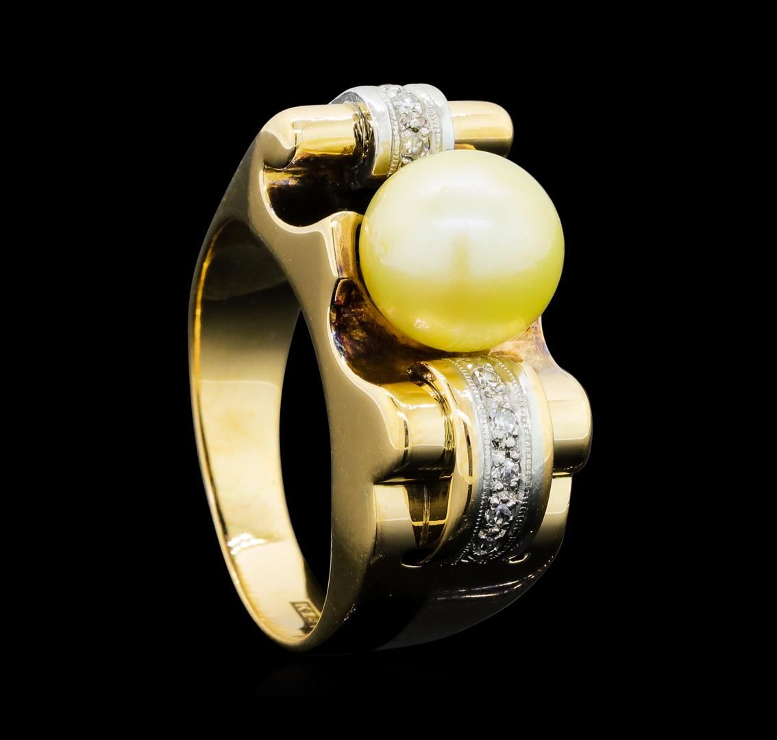 One lady's ring featuring: 14KT yellow and white weighing 9.9 grams containing one pearl measuring 8.8mm and single cut diamonds weighing 0.10ctw.