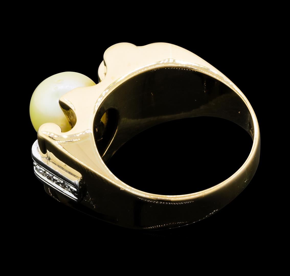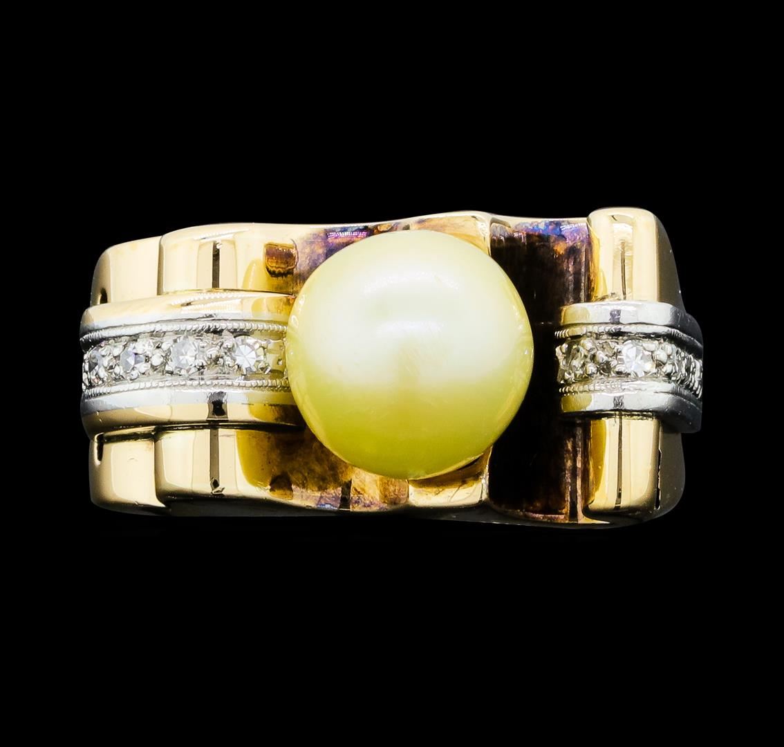 One lady's ring featuring: 14KT yellow and white weighing 9.9 grams containing one pearl measuring 8.8mm and single cut diamonds weighing 0.10ctw.