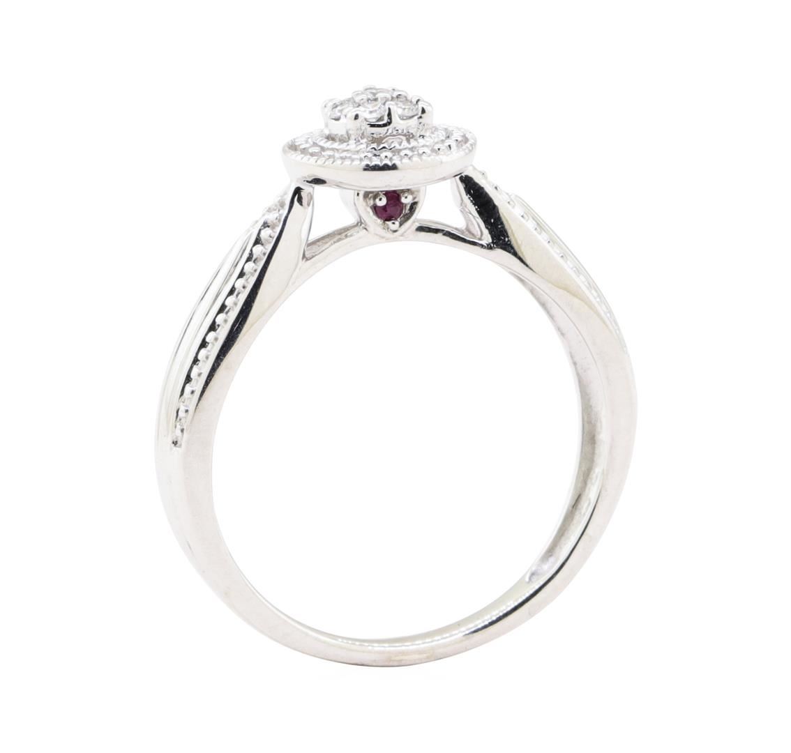 One ring featuring: 10KT white gold weighing 2.1 grams containing diamonds weighing 0.08ctw and rubies weighing 0.02ctw.