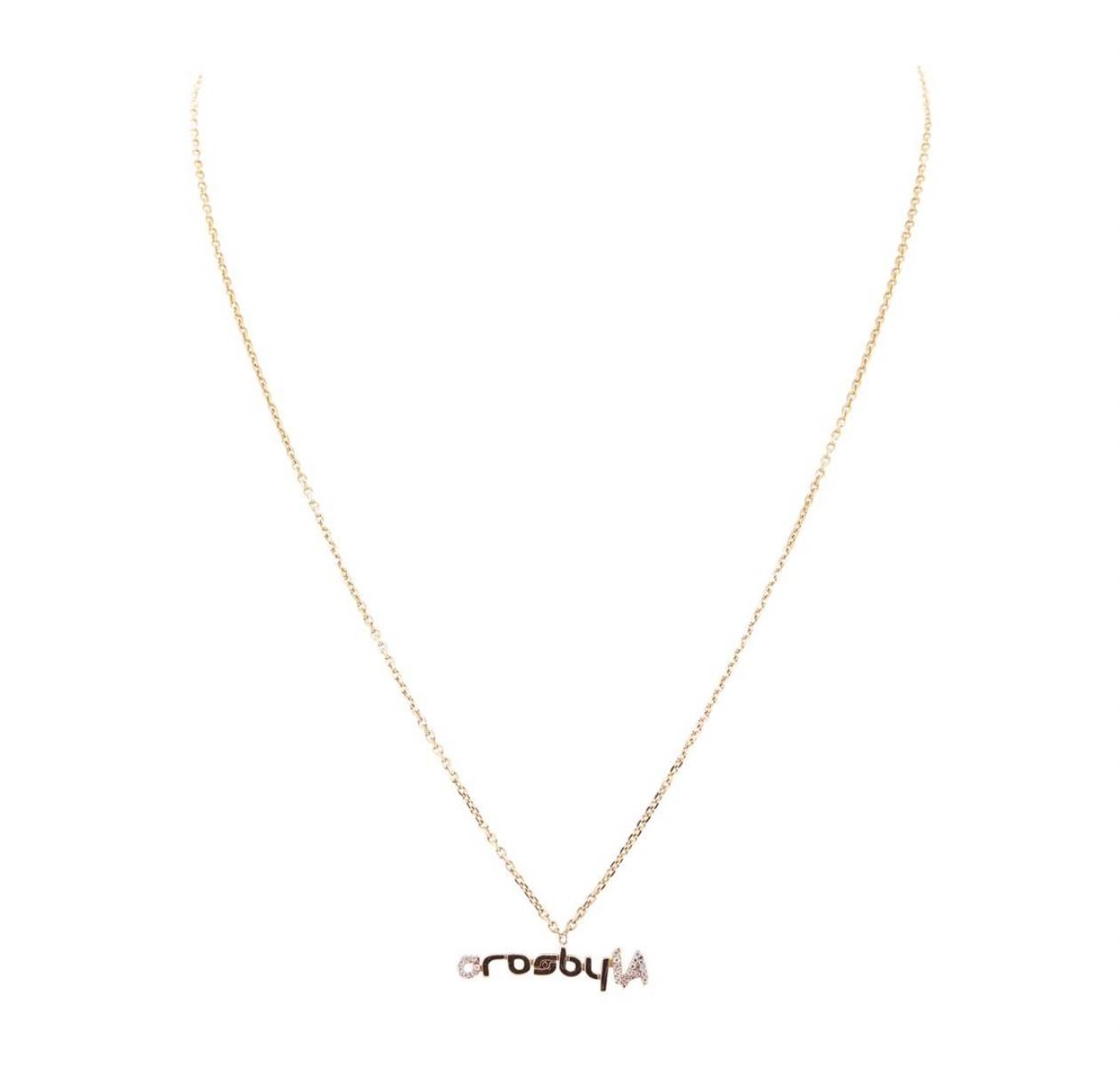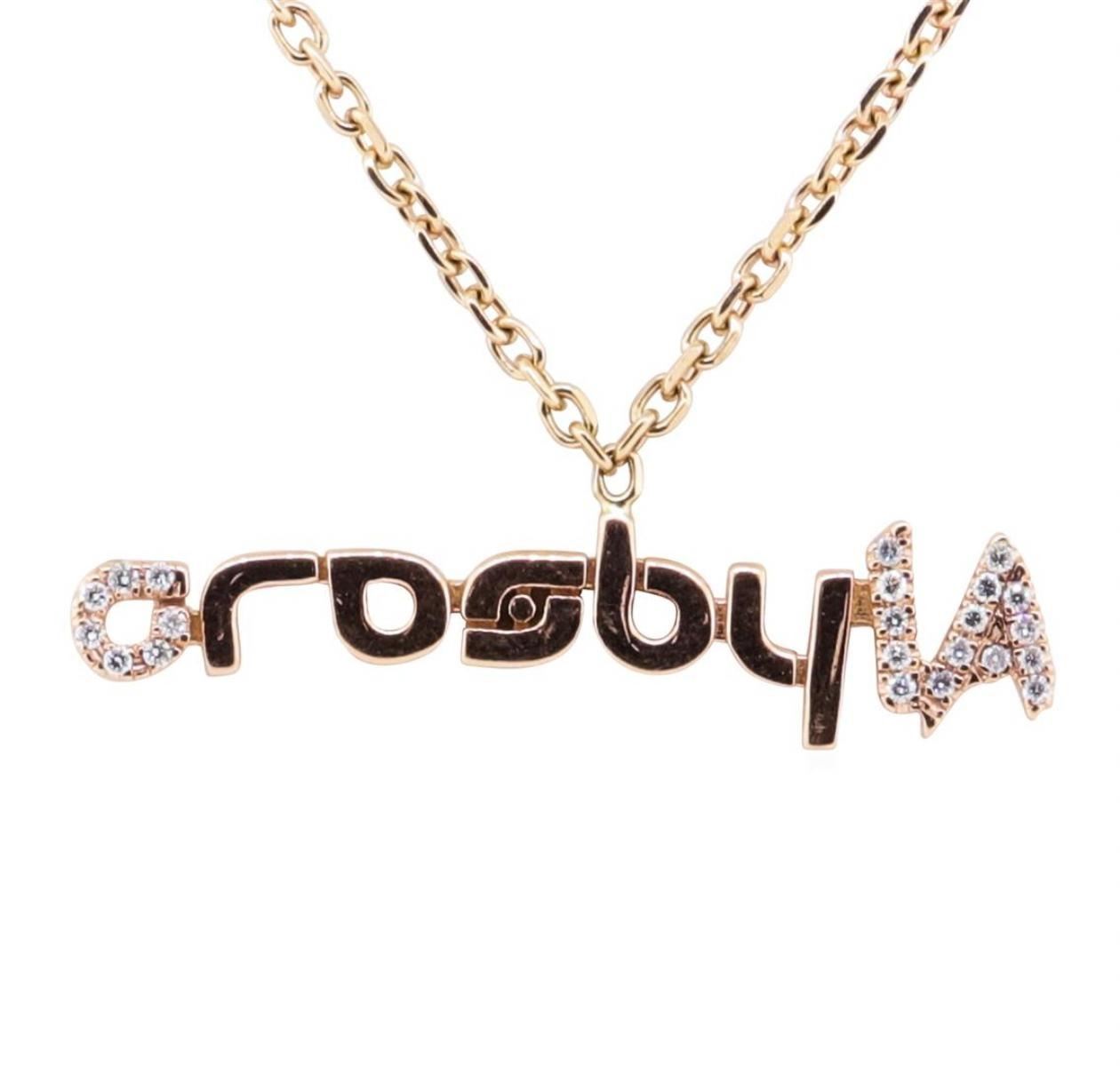 One "crosbyLA" pendant with chain featuring: 14KT rose gold weighing 5.8 grams containing diamonds weighing 0.10ctw. The chain is a 1.7mm diamond cut oval lin chain measuring twenty-two inches in length.
