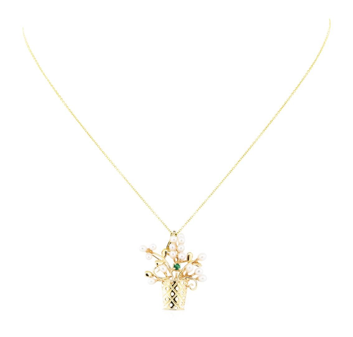 One floral pendant with chain featuring: 14KT yellow gold weighing 3.8 grams containing one emerald weighing 0.10ct and freshwater pearls. The chain is a 0.8mm rounded cable link chain measuring sixteen inches in length.