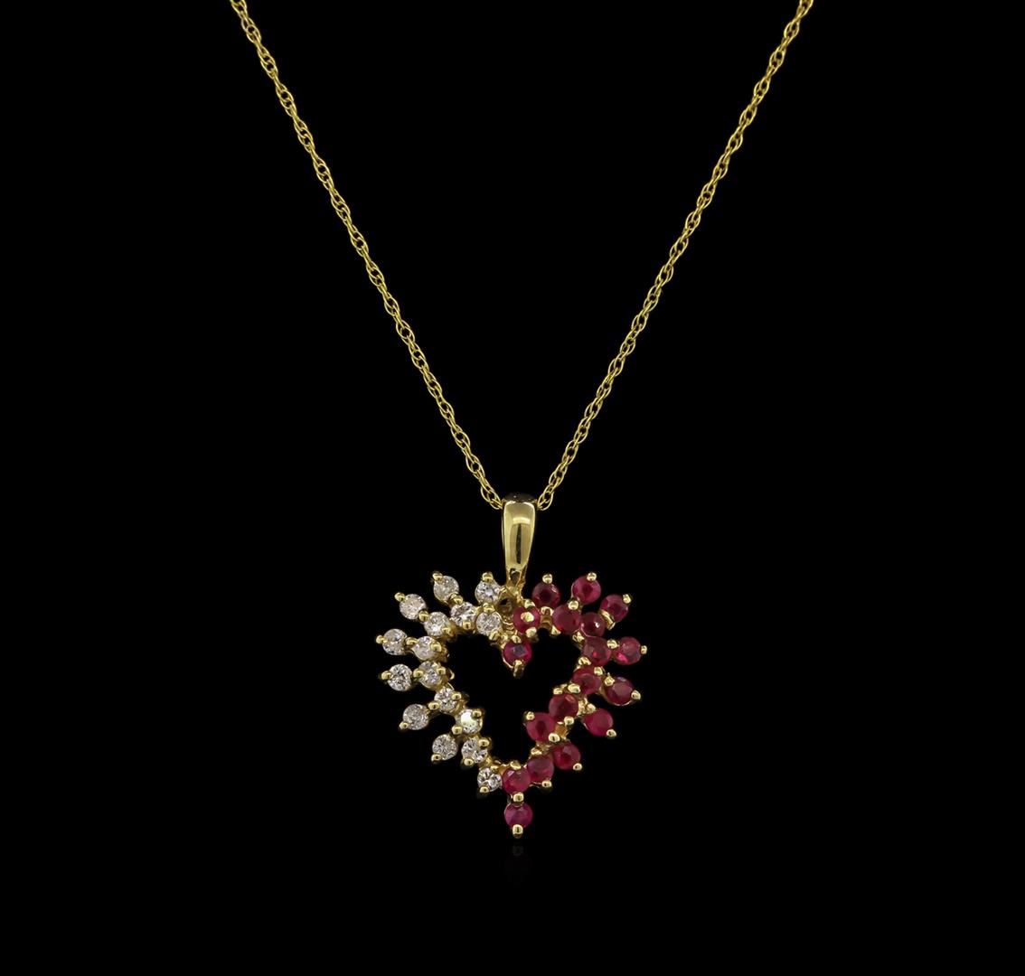 One pendant with chain featuring: 14KT yellow gold weighing 1.60 grams containing rubies with a total weight of 0.10ct and diamonds with a total weight of 0.10ct.