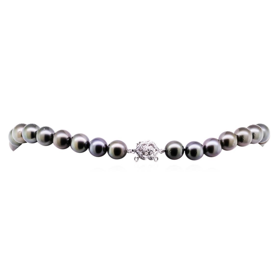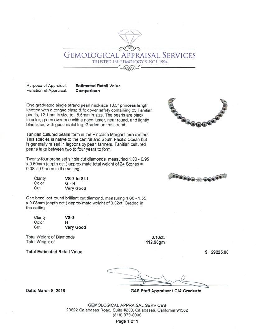 One graduated single strand pearl necklace 18.5" princess length, knotted with a tongue clasp & foldover safety containing 33 Tahitian pearls, 12.1mm in size to 15.6mm in size. The pearls are black in color, green overtone with a good luster, near round, and lightly blemished with good matching. Graded on the strand. Tahitian cultured pearls form in the Pinctada Margaritifera oysters. This species is native to the central and South Pacific Ocean but is generally raised in lagoons by pearl farmers. Tahitian cultured pearls take between two to four years to form. Twenty-Four prong set single cut diamonds, measuring 1.00 - 0.95 x 0.60mm (depth est.) approximate total weight of 24 Stones = 0.08ct. Graded in the setting. Clarity: VS-2 to SI-1. Color: G - Very Good One bezel set round brilliant cut diamond, measuring 1.60 - 1.55 x 0.98mm (depth est.) approximate weight of 0.02ct. Graded in the setting. Clarity: VS-2. Color: Very Good. Total Weight of Diamonds 0.10ct. Total Weight of 112.90gm. GAS Appraised at $29,225.00.