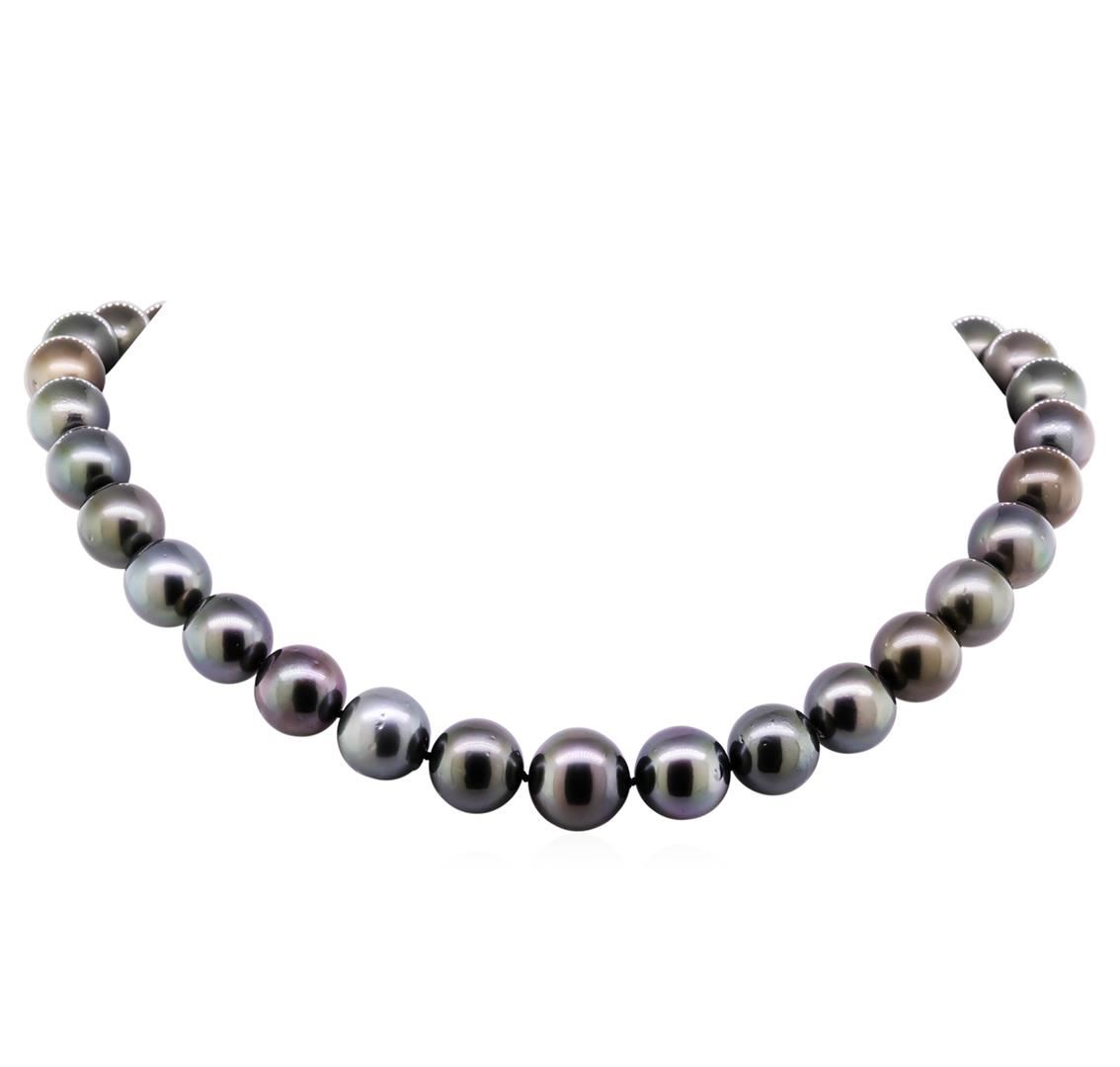 One graduated single strand pearl necklace 18.5" princess length, knotted with a tongue clasp & foldover safety containing 33 Tahitian pearls, 12.1mm in size to 15.6mm in size. The pearls are black in color, green overtone with a good luster, near round, and lightly blemished with good matching. Graded on the strand. Tahitian cultured pearls form in the Pinctada Margaritifera oysters. This species is native to the central and South Pacific Ocean but is generally raised in lagoons by pearl farmers. Tahitian cultured pearls take between two to four years to form. Twenty-Four prong set single cut diamonds, measuring 1.00 - 0.95 x 0.60mm (depth est.) approximate total weight of 24 Stones = 0.08ct. Graded in the setting. Clarity: VS-2 to SI-1. Color: G - Very Good One bezel set round brilliant cut diamond, measuring 1.60 - 1.55 x 0.98mm (depth est.) approximate weight of 0.02ct. Graded in the setting. Clarity: VS-2. Color: Very Good. Total Weight of Diamonds 0.10ct. Total Weight of 112.90gm. GAS Appraised at $29,225.00.
