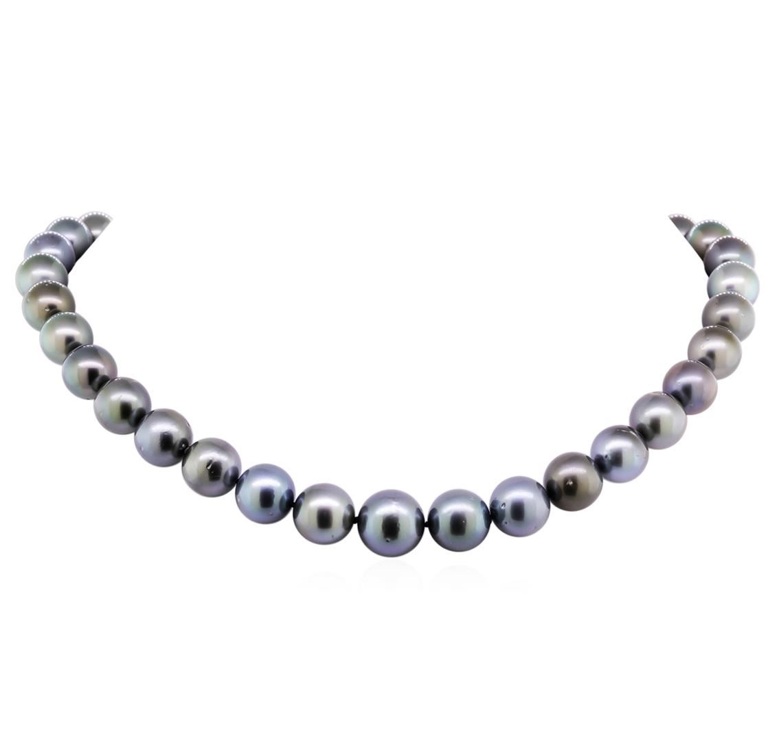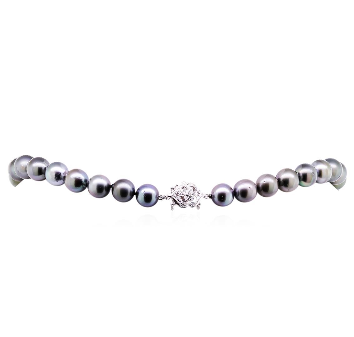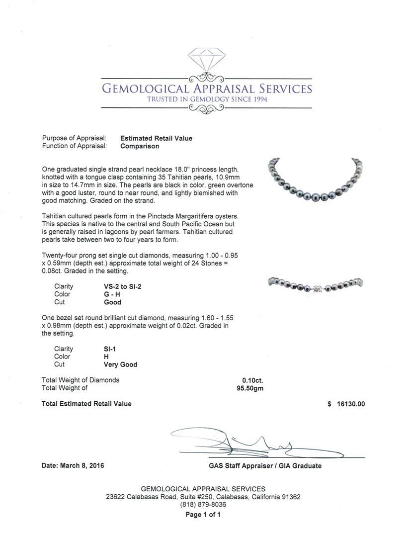 One graduated single strand pearl necklace 18.0" princess length, knotted with a tongue clasp containing 35 Tahitian pearls, 10.9mm in size to 14.7mm in size. The pearls are black in color, green overtone with a good luster, round to near round, and lightly blemished with good matching. Graded on the strand. Tahitian cultured pearls form in the Pinctada Margaritifera oysters. This species is native to the central and South Pacific Ocean but is generally raised in lagoons by pearl farmers. Tahitian cultured pearls take between two to four years to form. Twenty-Four prong set single cut diamonds, measuring 1.00 - 0.95 x 0.59mm (depth est.) approximate total weight of 24 Stones = 0.08ct. Graded in the setting. Clarity: VS-2 to SI-2. Color: G - Good One bezel set round brilliant cut diamond, measuring 1.60 - 1.55 x 0.98mm (depth est.) approximate weight of 0.02ct. Graded in the setting. Clarity: SI-1. Color: Very Good. Total Weight of Diamonds 0.10ct. Total Weight of 95.50gm. GAS Appraised at $16,130.00.