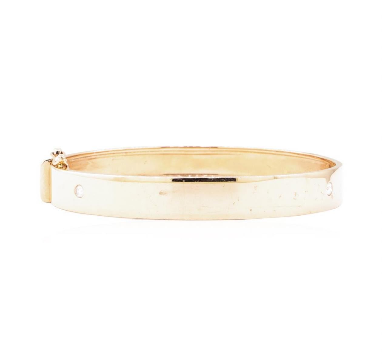 One electronically tested 14KT rose gold lady's combination cast & assembled fashion bangle bracelet with a tongue clasp with foldover safety with a bright polish finish. The bangle is flat with a 14KT white gold plunger clasp and measures 7 millimeters wide with a circumference of approximately six inches. Identified with markings of '14K'. Condition is new, good workmanship. Containing: Two bezel set round brilliant cut diamonds, measuring 2.55 - 2.50 x 1.52mm (depth est.) approximate total weight of 2 Stones = 0.12ct. Graded in the setting. Color G - H Clarity SI-1 to SI-2 Cut Very Good. Total Weight of Diamonds 0.12ct.. Total Weight of Bracelet 18.30gm GAS Appraised at $3665.00. GAS Appraised.
