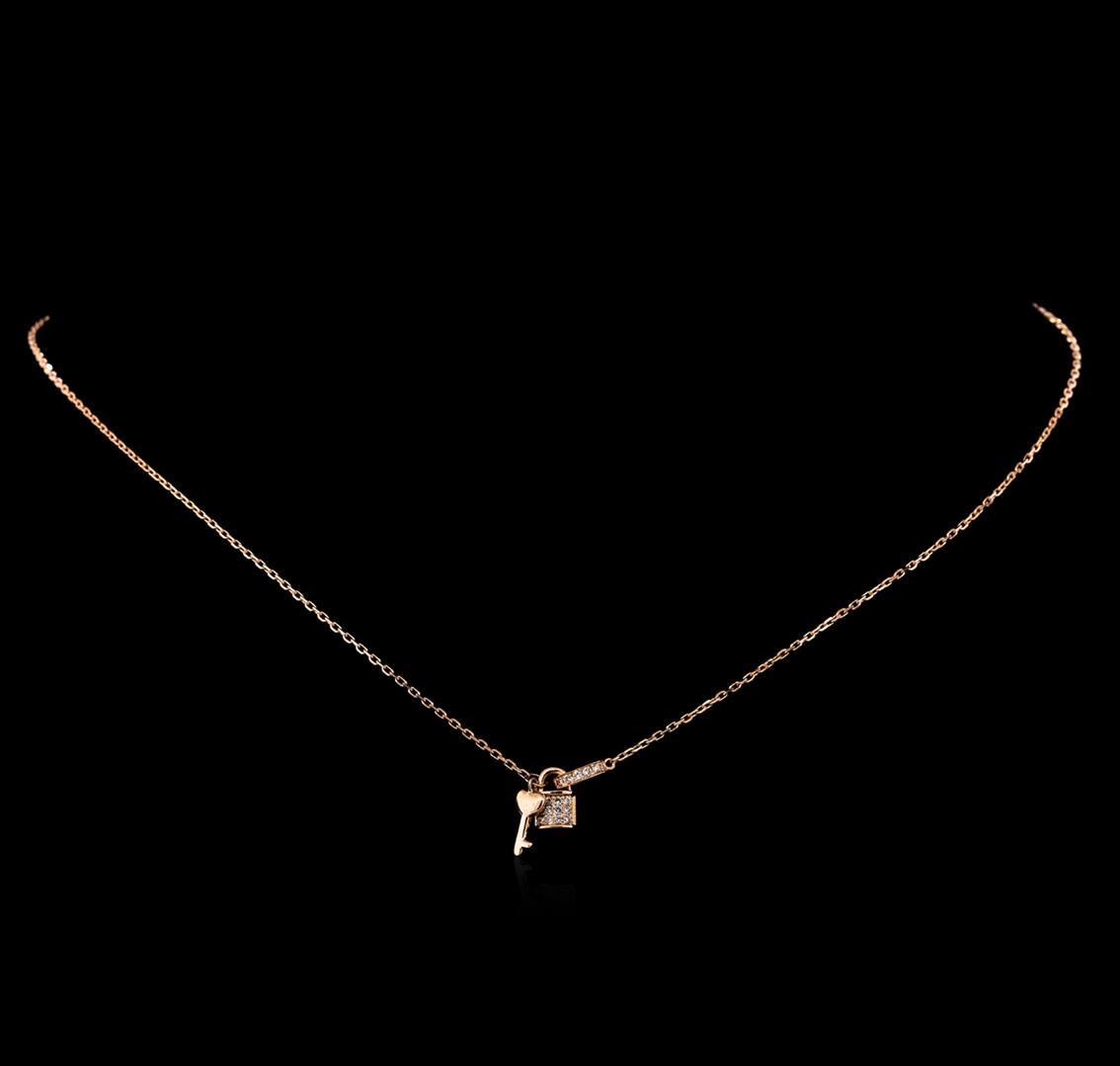 One lock and key pendant with chain featuring: 14KT rose gold weighing 2.70 grams containing diamonds with a total weight of 0.12ct.