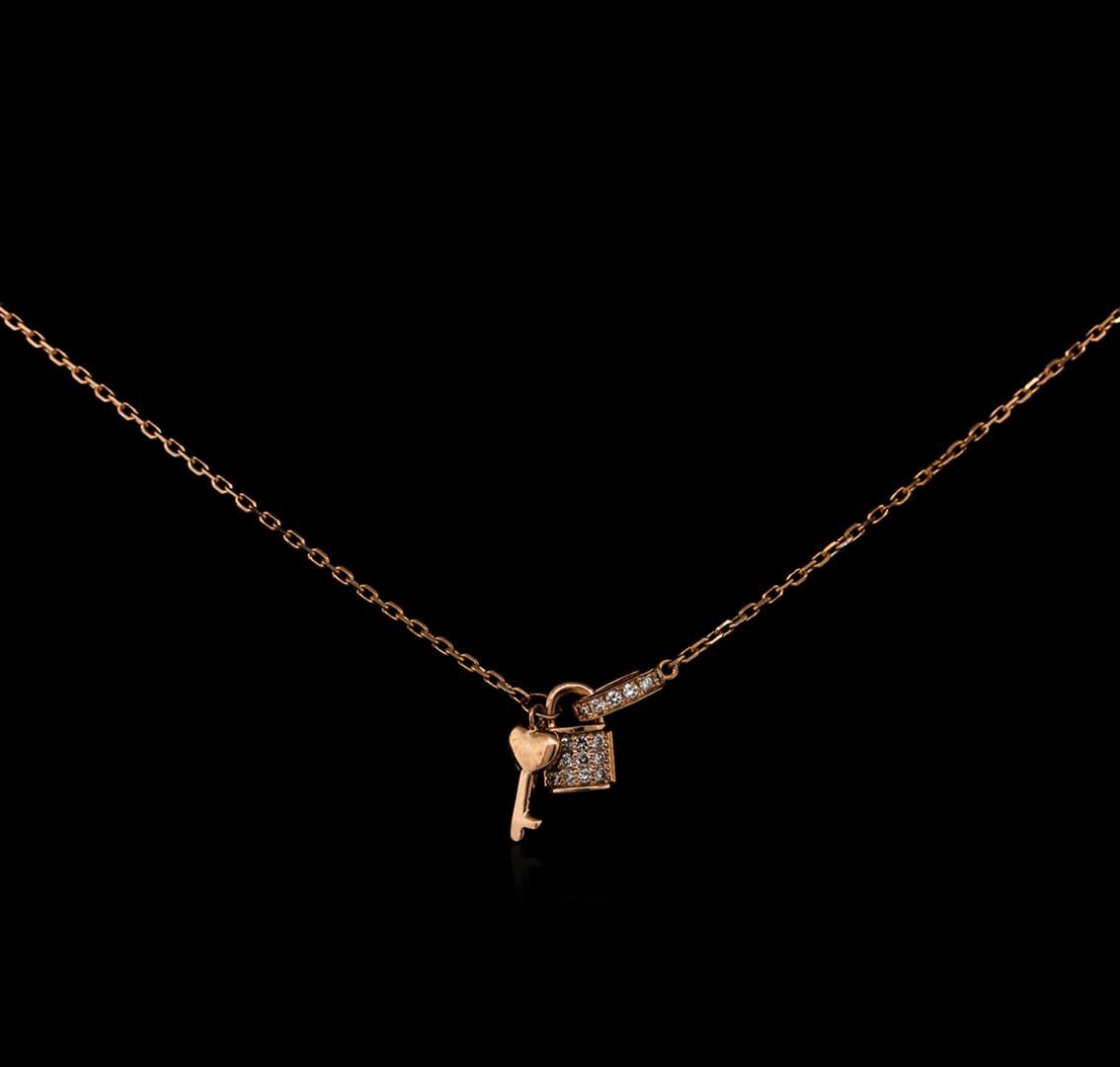 One lock and key pendant with chain featuring: 14KT rose gold weighing 2.70 grams containing diamonds with a total weight of 0.12ct.