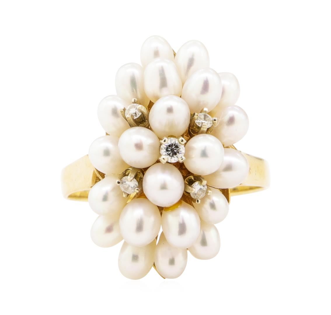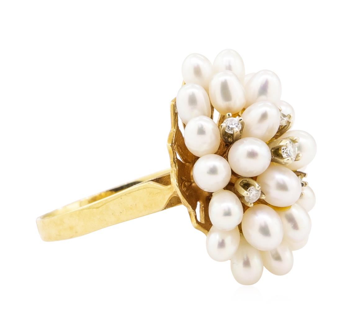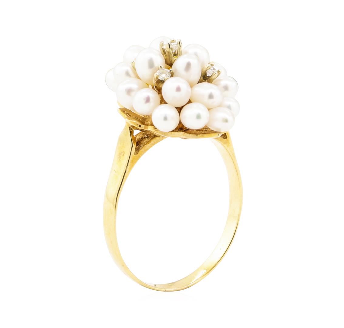 One clutser ring featuring: 14KT yellow gold weighing 6.5 grams containing diamonds weighing 0.12ctw and a cluster of freshwater pearls