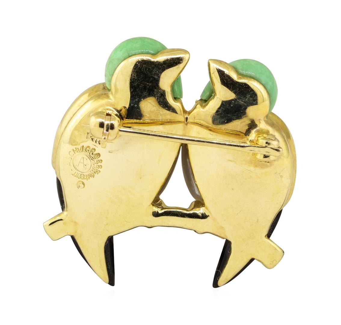 One electronically tested 14KT yellow gold lady's combination cast & assembled fashion designer lovebird pin with a bright polish finish. The featured lady's pin contains inlaid pieces of mother of pearl, lapis, black onyx, jade, and coral. Trademark is Asch-Grossbardt. Identified with markings of '14K'. Condition is new, good workmanship. Containing: Two bezel set round brilliant cut diamonds, measuring 1.90 - 1.85 x 1.17mm (depth est.) approximate total weight of 2 Stones = 0.05ct. Graded in the setting. Color G - H Clarity VS-1 to VS-2 Cut Very Good Six bead set round brilliant cut diamonds, measuring 1.50 - 1.45 x 0.92mm (depth est.) approximate total weight of 6 Stones = 0.07ct. Graded in the setting. Color G - H Clarity VS-1 to VS-2 Cut Very Good. Total Weight of Diamonds 0.12ct.. Total Weight of Lovebird Pin 9.20gm GAS Appraised at $3200.00. GAS Appraised.