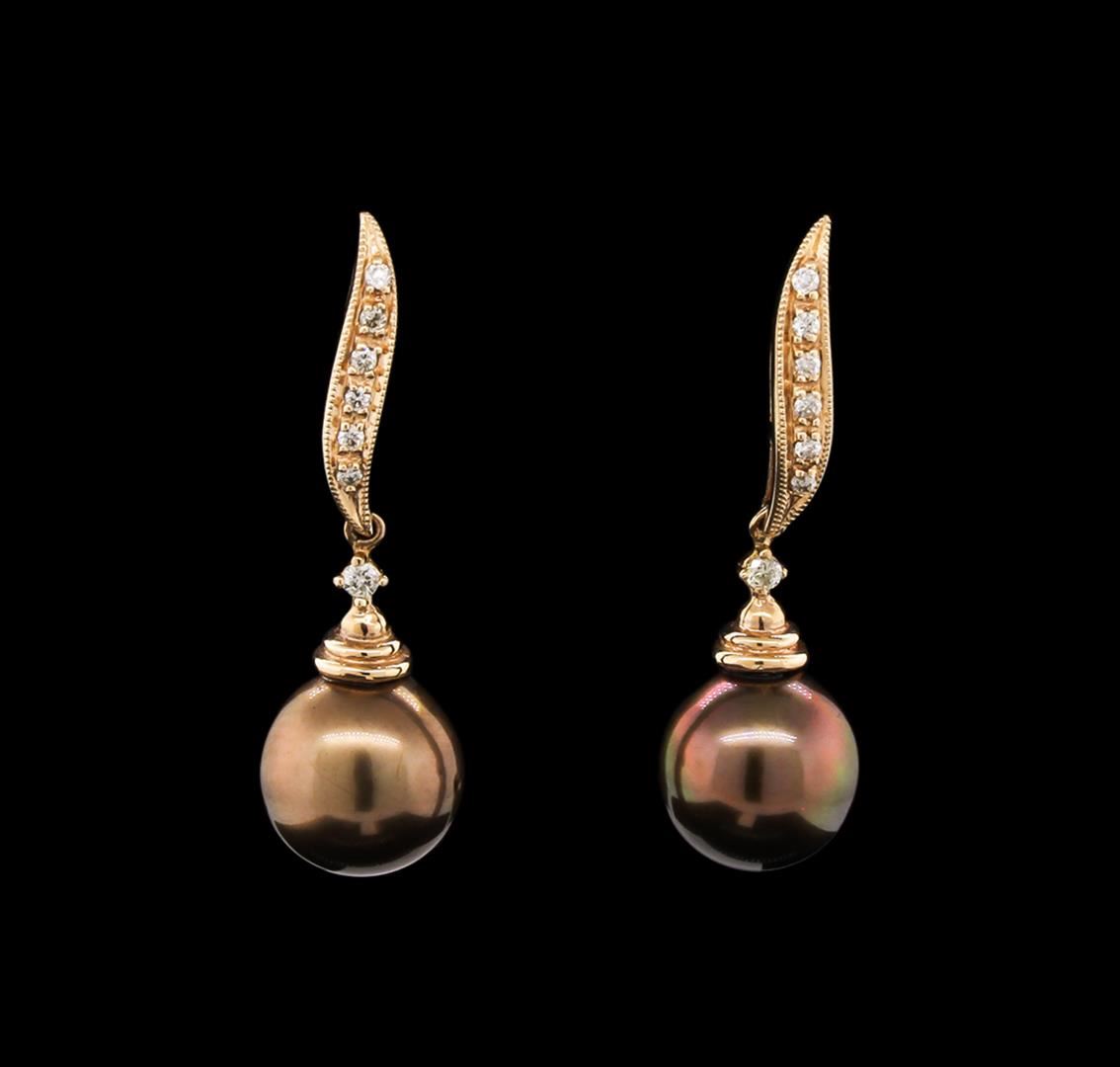 One pair electronically tested 14KT rose gold lady's combination cast & assembled fashion dangle earrings with friction posts with a bright polish with milgrain detailing finish. Identified with markings of "14K". Condition is used, good workmanship. Containing: Two Tahitian pearls, 9.7mm in size to 9.5mm in size. The pearls are dyed copper in color with a good luster, round, and lightly blemished. Graded in the setting. Two prong set round brilliant cut diamonds, measuring 1.60 - 1.55 x 0.95mm (depth est.) approximate. Total Weight of 2 Stones = 0.04ct. Graded in the setting. Clarity: SI-1. Color: I. Cut Good Twelve bead set round brilliant cut diamonds, measuring 1.20 - 1.10 x 0.72mm (depth est.) approximate. Total Weight of 12 Stones = 0.08ct. Graded in the setting. Clarity: SI-1. Color: H - I. Cut Very Good. Total Weight of Diamonds 0.12ct. Total Weight of Earrings 4.20gm. GAS Appraised.