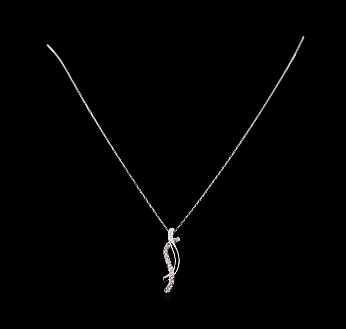 One electronically tested 14KT white gold lady's combination cast & assembled fashion pendant & chain 18.0' long, 1mm diamond cut oval cable link with a spring ring clasp with a bright polish finish. The featured lady's pendant and chain has a drop measuring 39 millimeters in length. Identified with markings of '14K'. Condition is new, good workmanship. Containing: Eleven prong set round brilliant cut diamonds, measuring 1.50 - 1.40 x 0.90mm (depth est.) approximate total weight of 11 Stones = 0.13ct. Graded in the setting. Clarity SI-2 to I-1. Color: H - I Cut Good. Total Weight of Diamonds 0.13ct.. Total Weight of Pendant & Chain 2.80gm. GAS Appraised at $865.00.