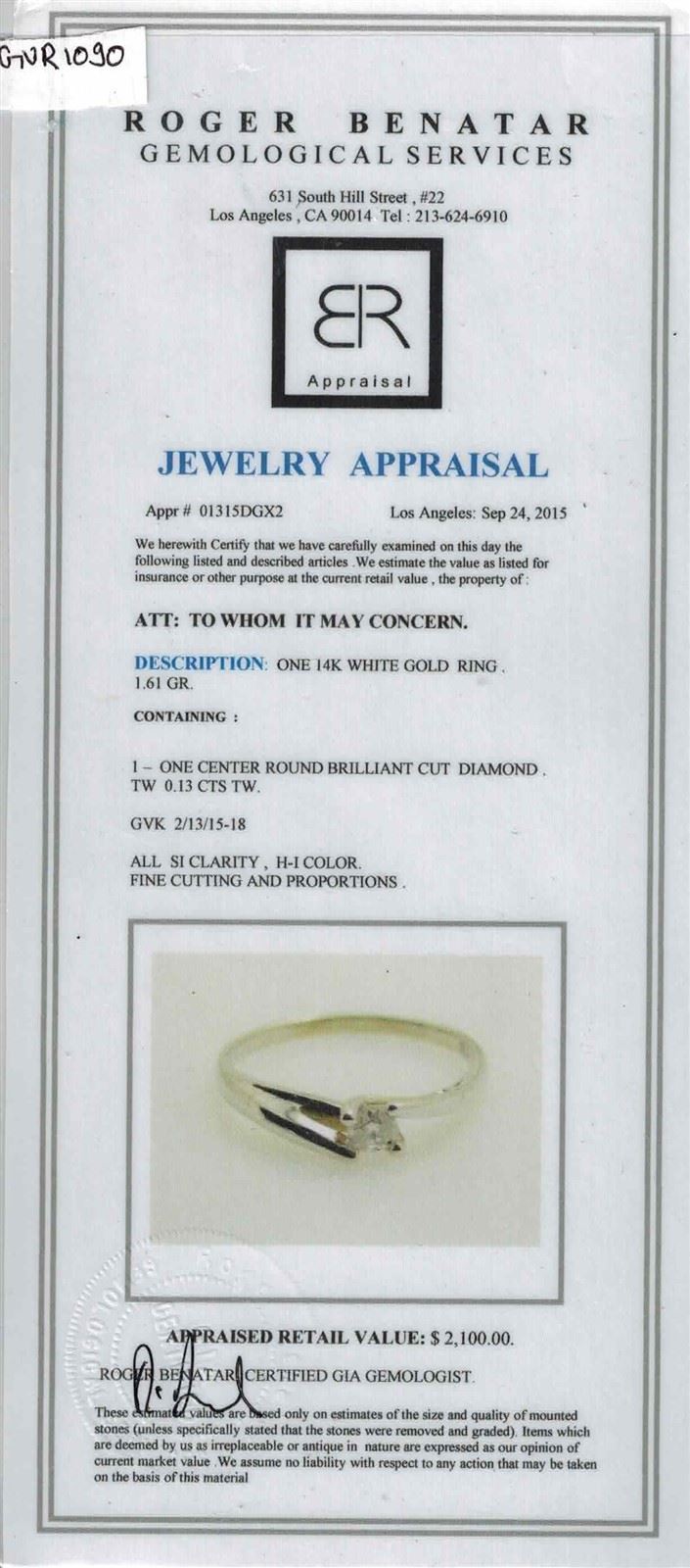 14K WHITE GOLD NATURAL DIAMOND RING:1.61GRAMS/DIMAOND:0.13CT//#GVR1090 **Artfully crafted in 14k white gold, this 0.13ct Round Brilliant Cut Diamond Solitaire sparkles dynamically. A stone of mental and psychic activation, Diamonds promote truth, vision and alignment with the higher mind, for those who use them consciously. This engagement ring's sleek beauty is timeless and eternal.**