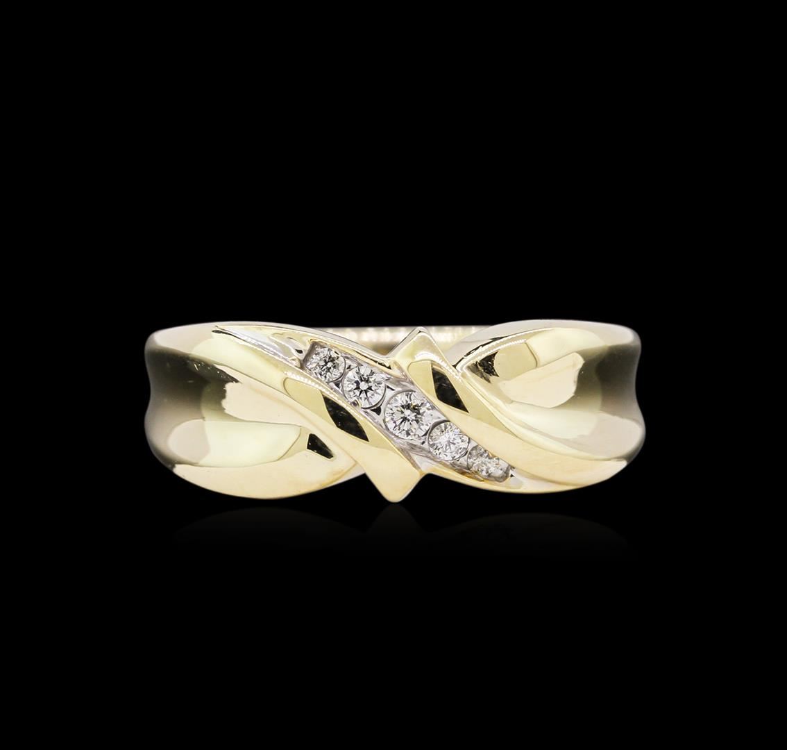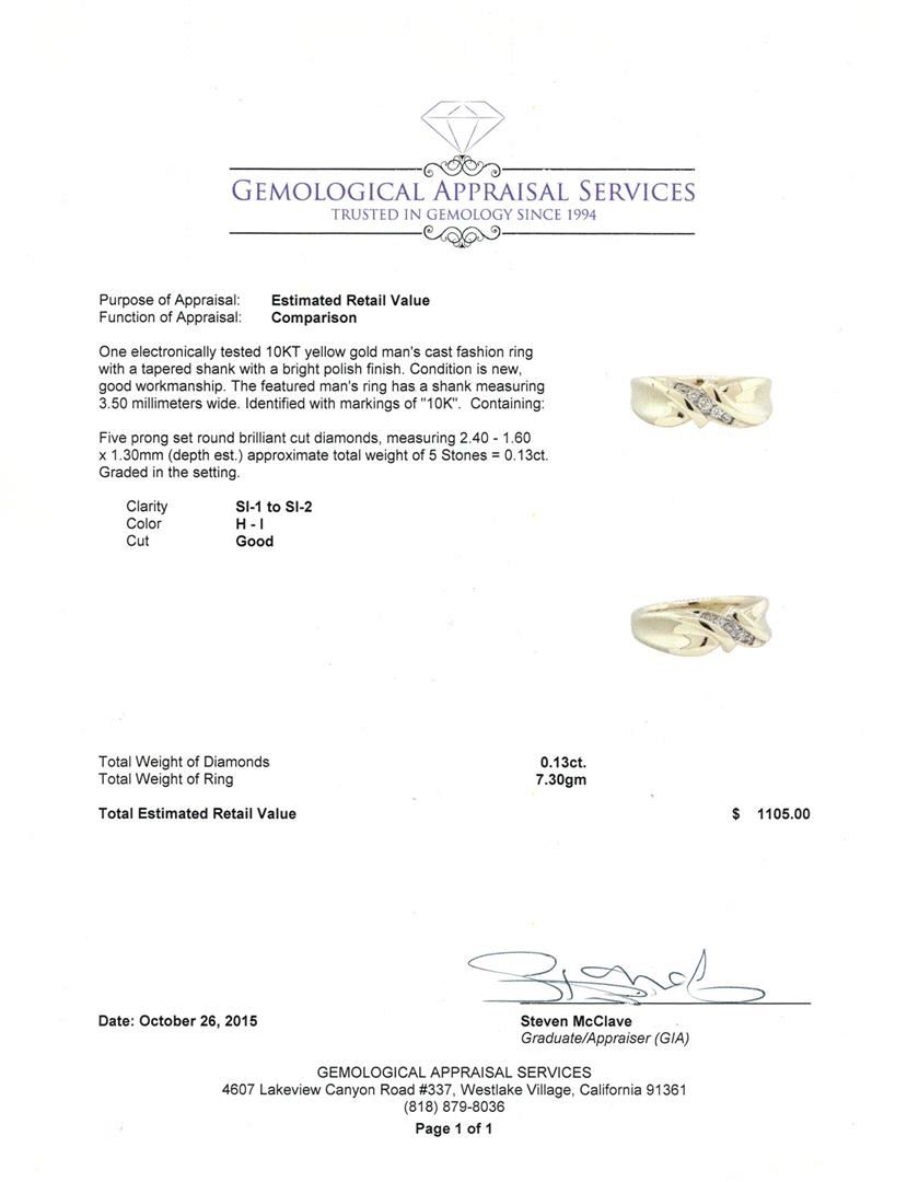 One electronically tested 10KT yellow gold man's cast fashion ring with a tapered shank with a bright polish finish. The featured man's ring has a shank measuring 3.50 millimeters wide. Identified with markings of "10K". Condition is new, good workmanship. Containing: Five prong set round brilliant cut diamonds, measuring 2.40 - 1.60 x 1.30mm (depth est.) approximate total weight of 5 Stones = 0.13ct. Graded in the setting. Clarity: SI-1 to SI-2. Color: H - I. Cut Good. Total Weight of Diamonds 0.13ct. Total Weight of Ring 7.30gm. GAS Appraised at $1,105.00.