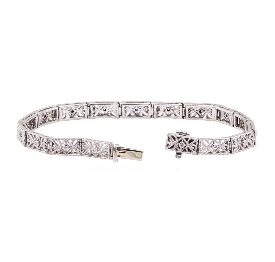 One electronically tested platinum lady's combination cast & assembled vintage style fashion tennis bracelet with a tongue clasp with fold-under safety with a bright polish with milgrain detailing finish. The featured lady's bracelet measures approximately 6.5 inches in length. Identified with markings of 'IRID PLAT'. Condition is like new, good workmanship. Containing: Seventeen prong set round brilliant cut diamonds, measuring 1.35 - 1.30 x 0.80mm (depth est.) approximate total weight of 17 Stones = 0.14ct. Graded in the setting. Color H - I Clarity VS-2 to SI-1 Cut Good. Total Weight of Diamonds 0.14ct.. Total Weight of Bracelet 16.30gm GAS Appraised at  $2975.00. GAS Appraised at $2,975.00.