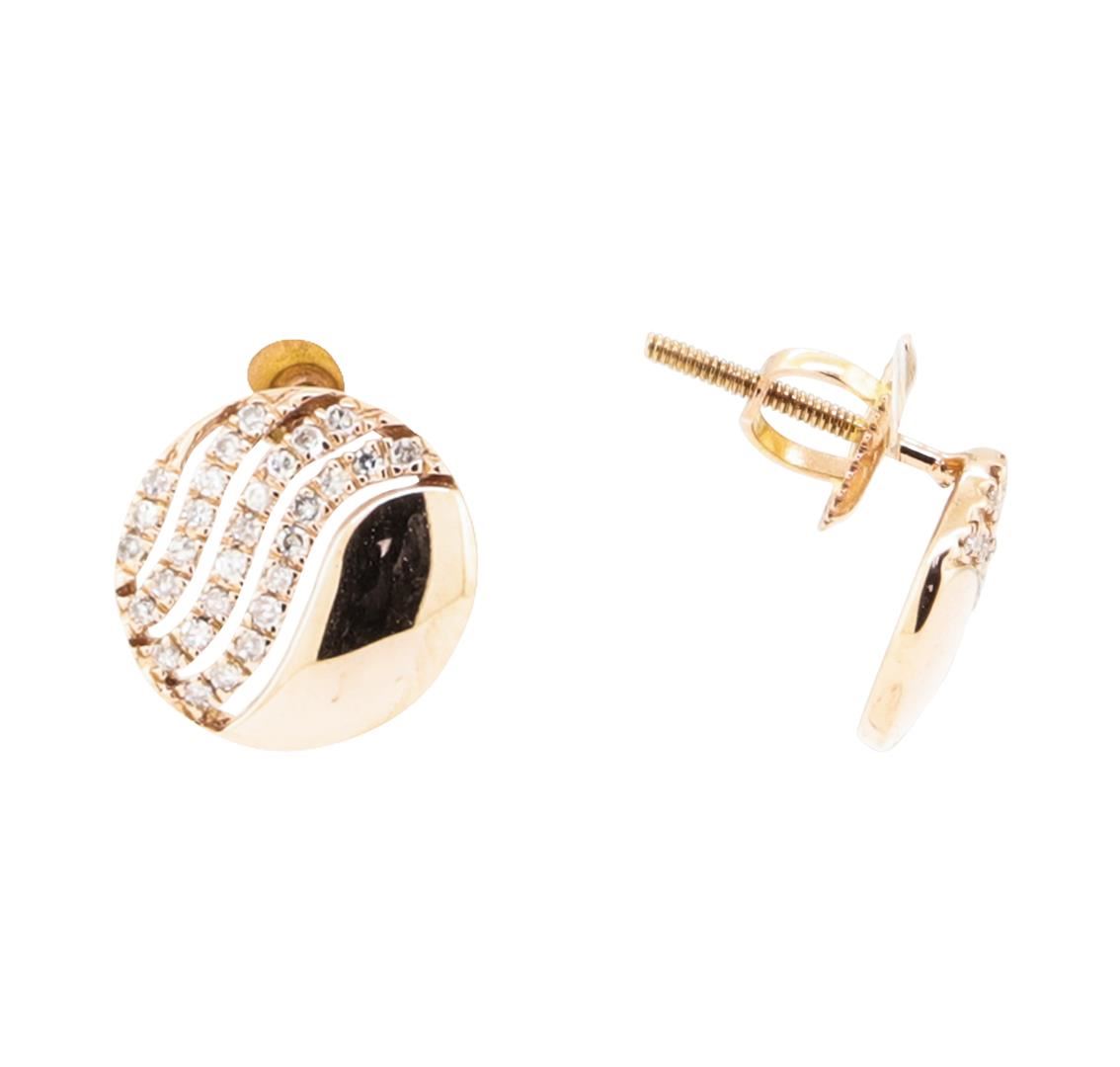 One pair of rounded disc earrings with threaded screw-on/off backs featuring: 14KT rose gold weighing 1.6 grams containing diamonds weighing 0.14ctw.