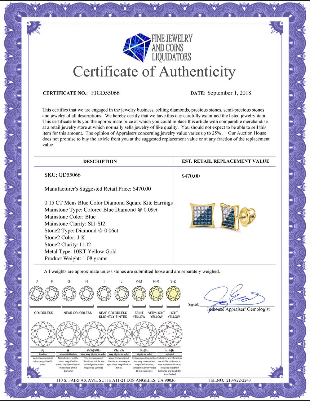 REF-12M2H- SKU: GD55066 ---- 0.15 CTW Mens Blue Color Diamond Square Kite Cluster Earrings 10KT Yellow Gold