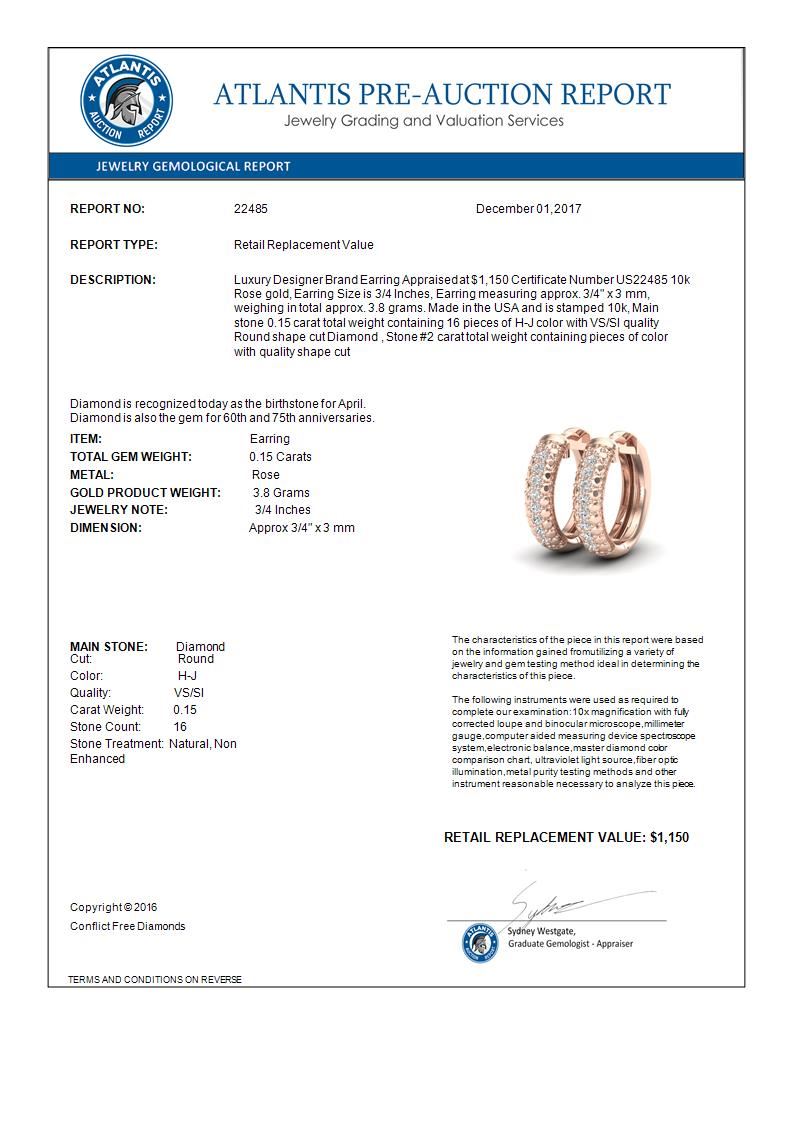 REF-26K2W -22485 ---- 0.15 CTW Micro Pave Hoop VS/SI Diamond Earrings 10K Rose Gold ---- Luxury Designer Brand Earring Appraised at $1,150 Certificate Number US22485 10k Rose gold, Earring Size is 3/4 Inches, Earring measuring approx. 3/4" x 3 mm, weighing in total approx. 3.8 grams. Made in the USA and is stamped 10k, Main stone 0.15 carat total weight containing 16 pieces of H-J color with VS/SI quality Round shape cut Diamond , Stone #2 carat total weight containing pieces of color with quality shape cut