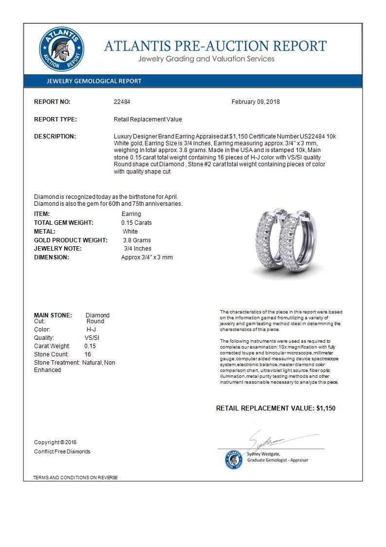 REF-26M2H -22484 ---- 0.15 CTW Micro Pave Hoop VS/SI Diamond Earrings 10K White Gold ---- Luxury Designer Brand Earring Appraised at $1,150 Certificate Number US22484 10k White gold, Earring Size is 3/4 Inches, Earring measuring approx. 3/4" x 3 mm, weighing in total approx. 3.8 grams. Made in the USA and is stamped 10k, Main stone 0.15 carat total weight containing 16 pieces of H-J color with VS/SI quality Round shape cut Diamond , Stone #2 carat total weight containing pieces of color with quality shape cut