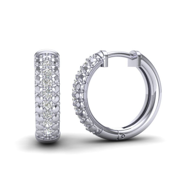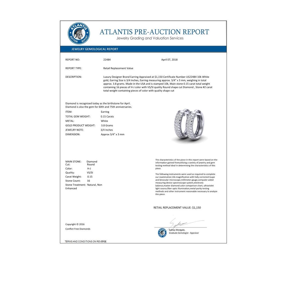 REF-26M2H -22484 ---- 0.15 CTW Micro Pave Hoop VS/SI Diamond Earrings 10K White Gold ---- Luxury Designer Brand Earring Appraised at $1,150 Certificate Number US22484 10k White gold, Earring Size is 3/4 Inches, Earring measuring approx. 3/4" x 3 mm, weighing in total approx. 3.8 grams. Made in the USA and is stamped 10k, Main stone 0.15 carat total weight containing 16 pieces of H-J color with VS/SI quality Round shape cut Diamond , Stone #2 carat total weight containing pieces of color with quality shape cut