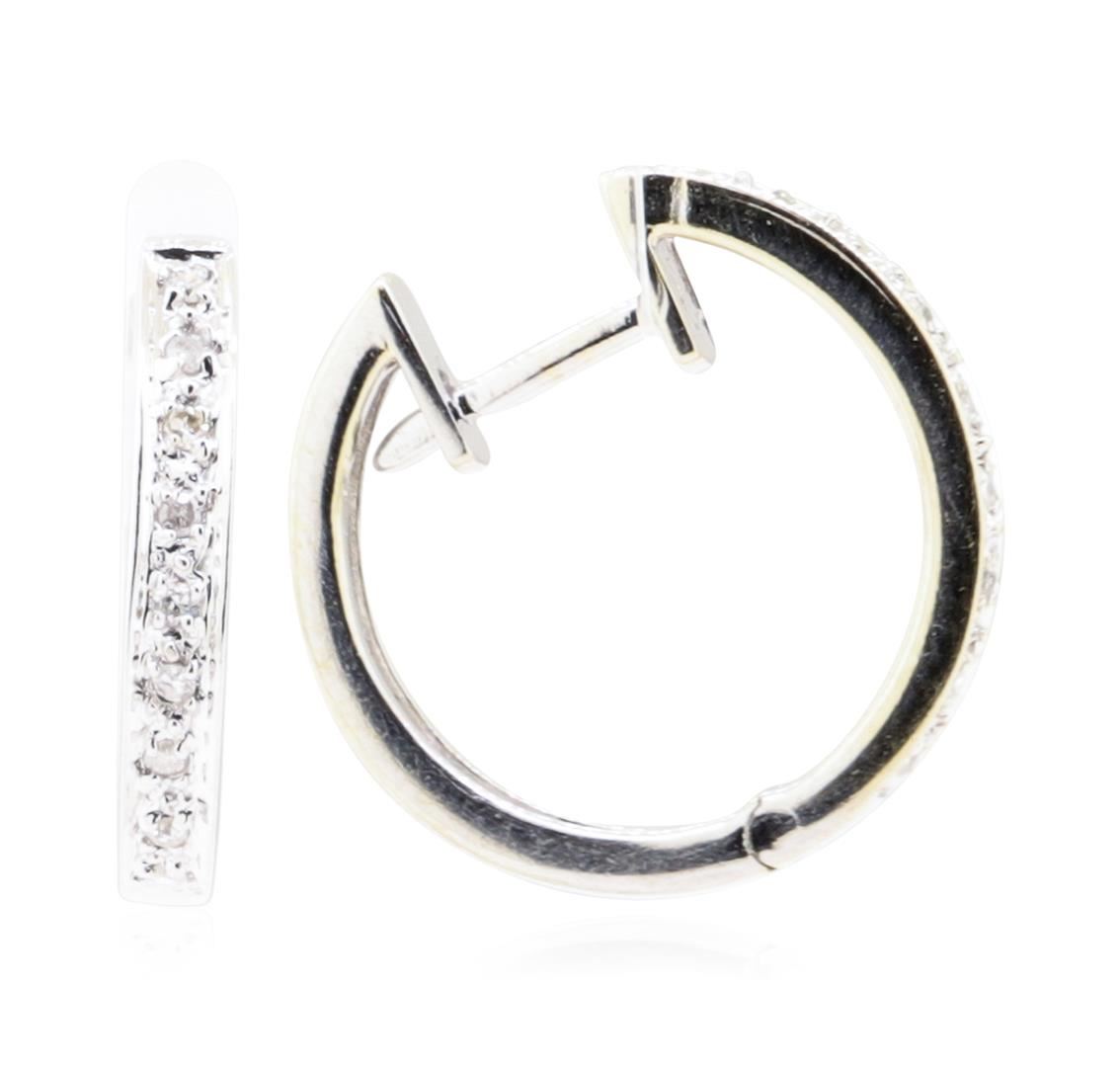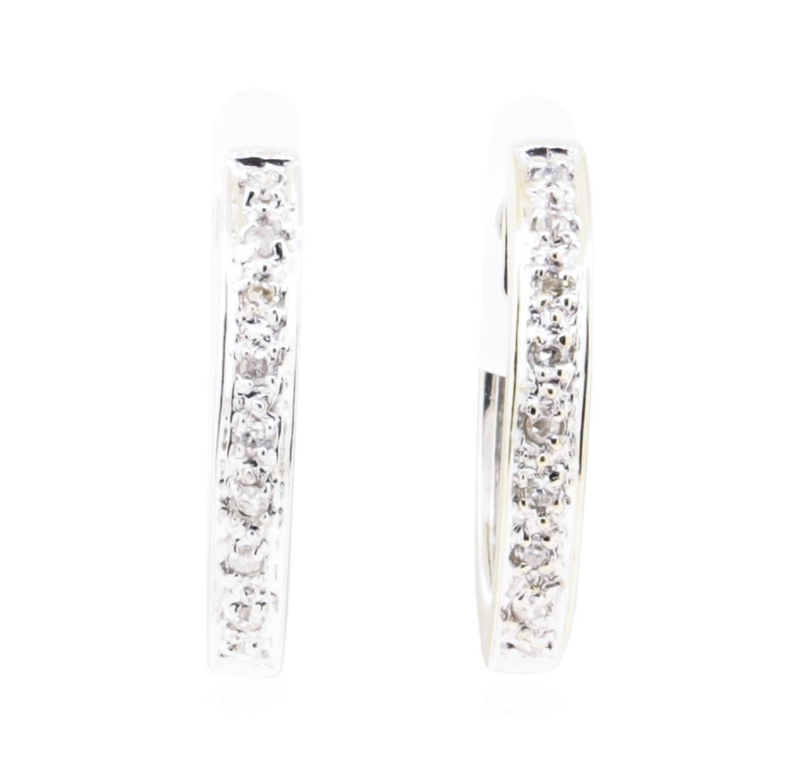 One pair of hoop earrings with hinged clip backs featuring: 14KT white gold weighing 3.8 grams containing diamonds weighing 0.15ctw.