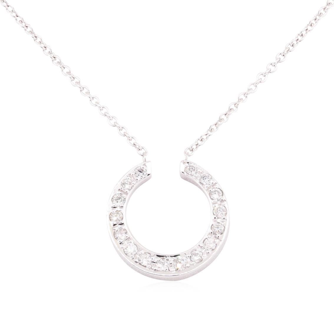 One pendant with chain featuring: 14KT white gold weighing 3.3 grams containing diamonds weighing 0.15ctw. The attached chain can be worn between sixteen and eighteen inches in length.