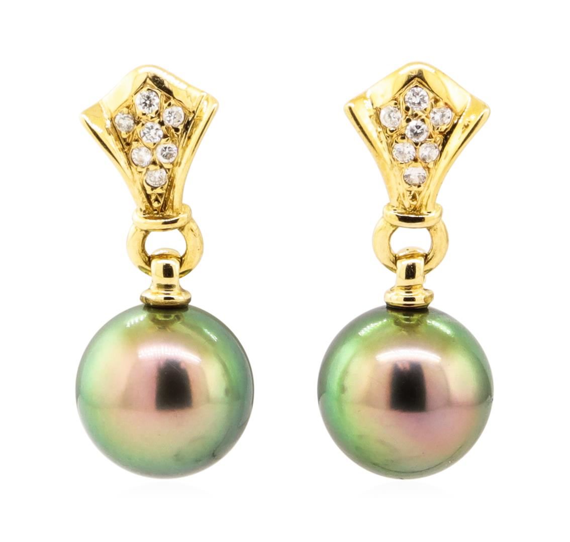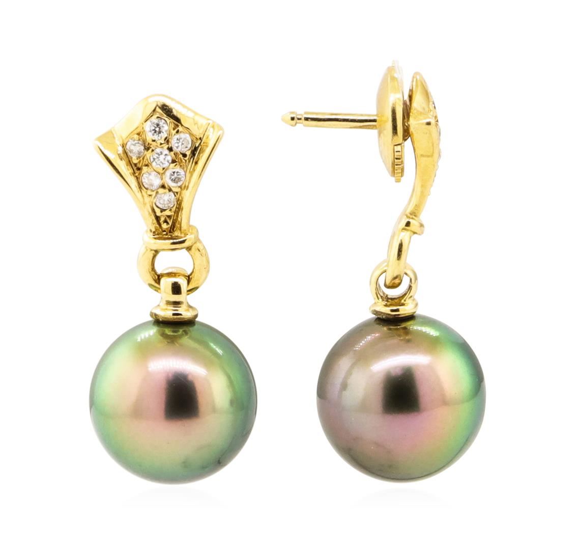 One pair electronically tested 18KT yellow gold lady's combination cast & assembled fashion dangle earrings with La Pousette posts and backs with a bright polish finish. The featured lady's earrings have a drop of approximately twenty-seven millimeters. Identified with markings of '18K 750'. Condition is new, good workmanship. Containing: Two Tahitian pearls, 11.0mm to 10.8mm in size. The pearls are peacock in color, ros� overtone with an excellent luster, round, and clean with excellent matching. Graded in the setting. Fourteen bead set round brilliant cut diamonds, measuring 1.45 - 1.40 x 0.89mm (depth est.) approximate total weight of 14 Stones = 0.15ct. Graded in the setting. Color G - H Clarity VS-1 to SI-1 Cut Good. Total Weight of Diamonds 0.15ct.. Total Weight of Earrings 6.60gm GAS Appraised at $3915.00. GAS Appraised.
