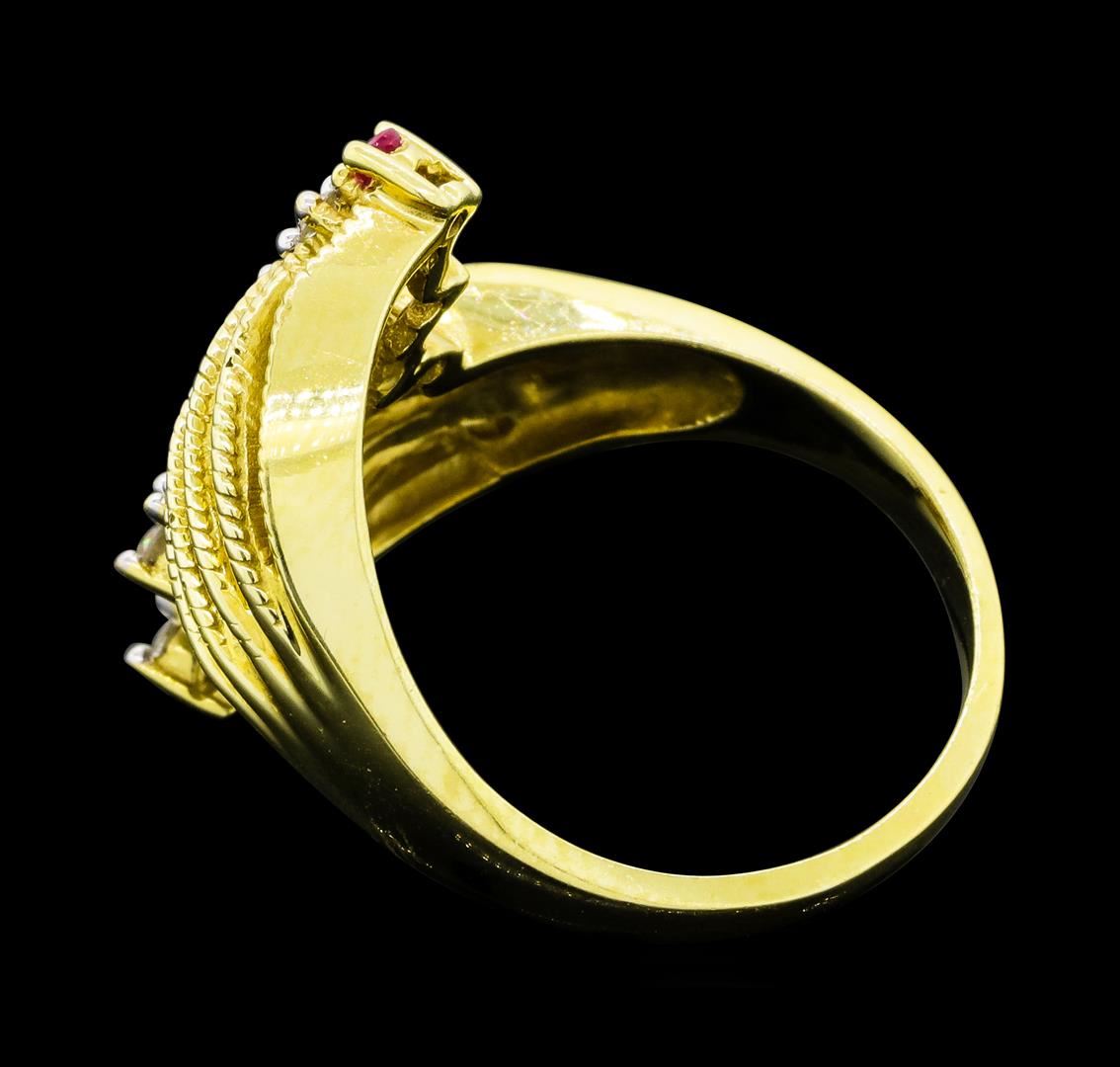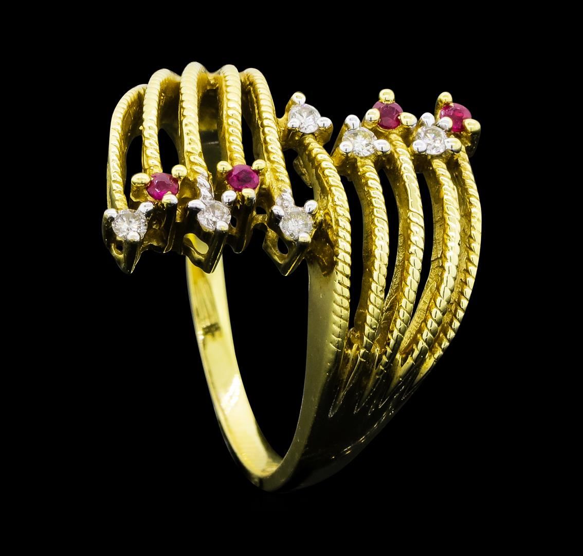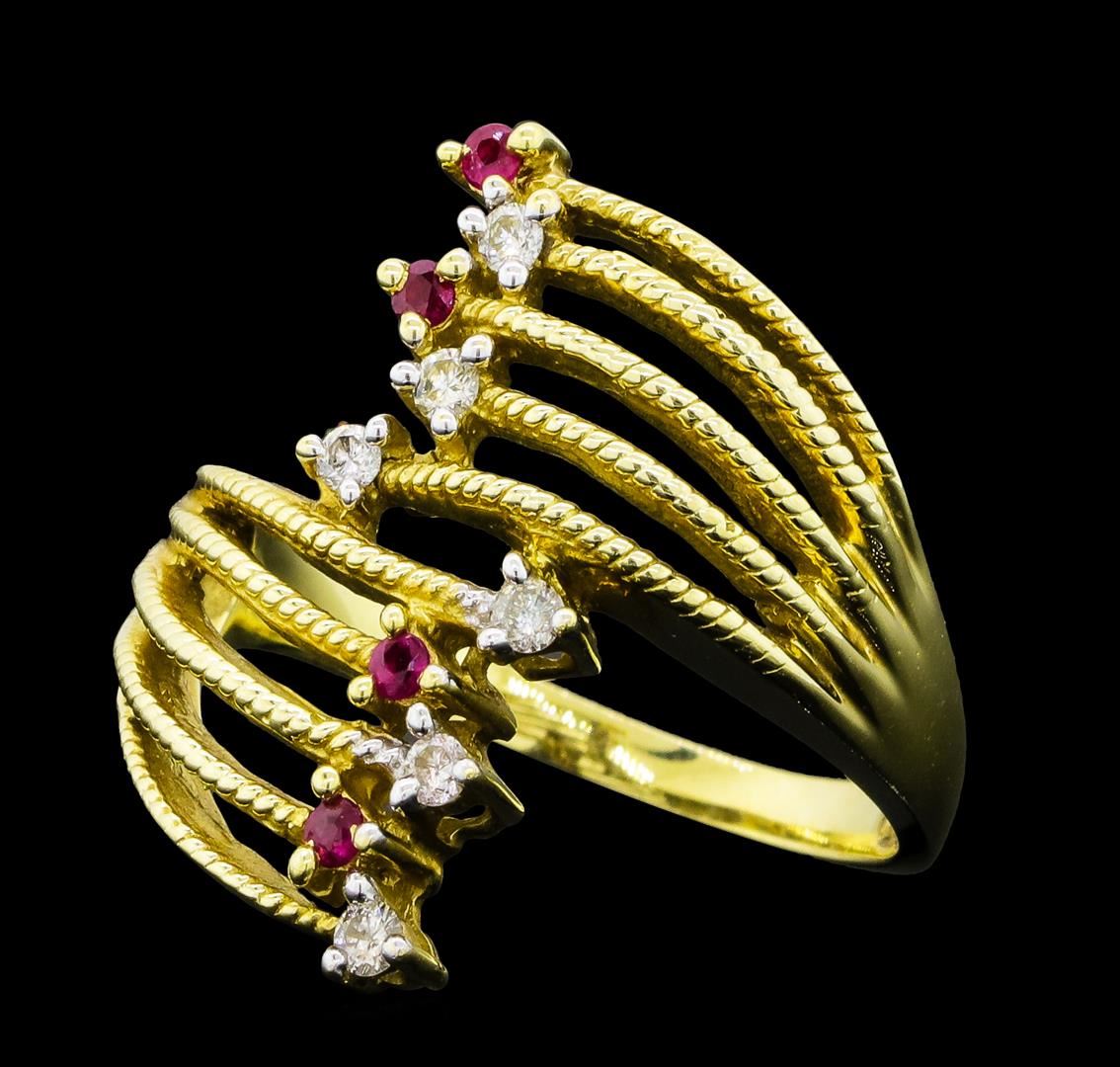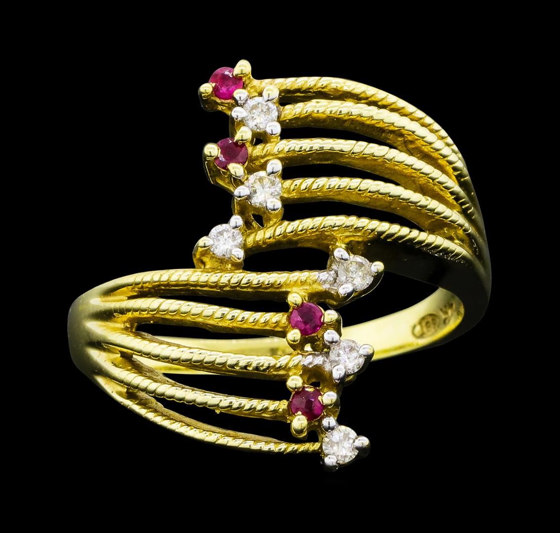 One lady's bypass ring featuring: 14KT yellow gold weighing 7.0 grams containing diamonds weighing 0.15ctw and rubies weighing 0.10ctw.